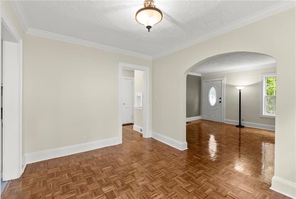 Discover this charming, updated 2-bedroom, 1-bathroom home with a spacious private yard, perfectly situated just minutes from downtown Atlanta. Updates include gleaming hardwood floors, fresh paint throughout, updated light fixtures, new hardiplank siding, new windows and more! Crown molding adds a touch of sophistication, while numerous new double-pane windows fill the space with natural light. Enter into the heart of the home, the spacious living room with a cozy fireplace, and a large arched doorway leading to the dining room for that open-concept feel. The updated kitchen is equipped with granite countertops and stainless steel appliances.