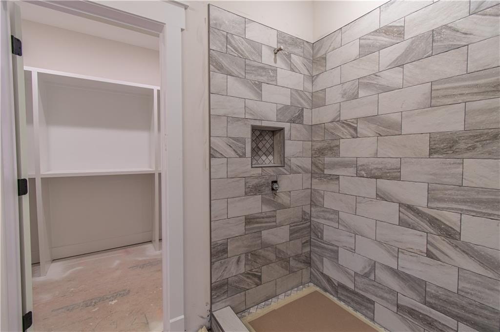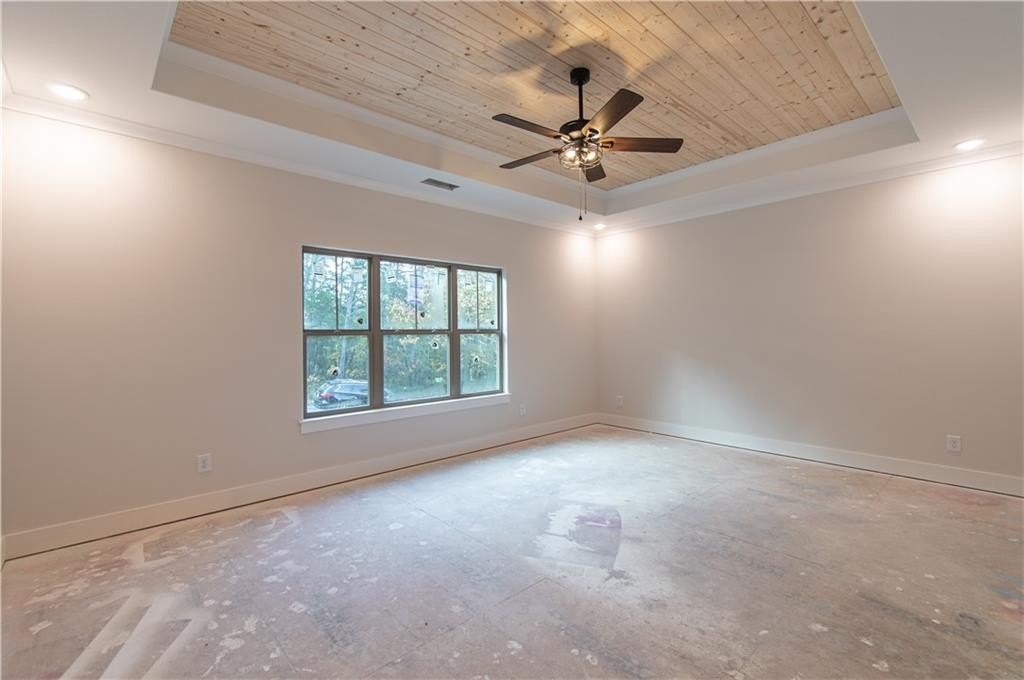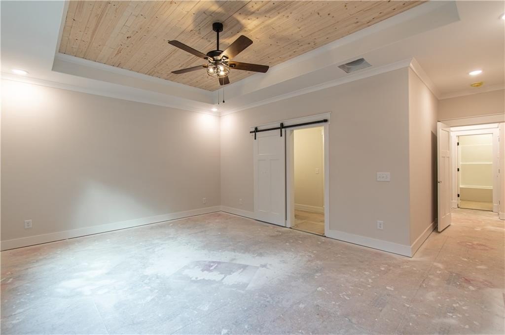 The primary suite offers a touch of luxury with a tongue-and-groove coffered ceiling, a custom wood-shelved walk-in closet, and primary bath featuring a double vanity, large tiled shower, and private water closet.