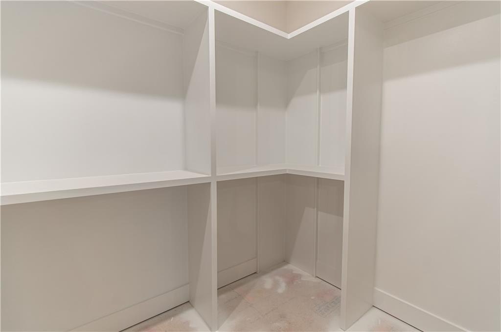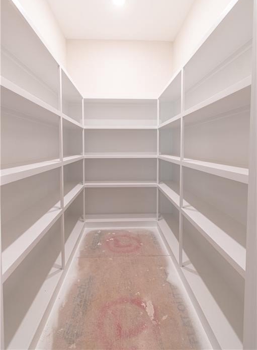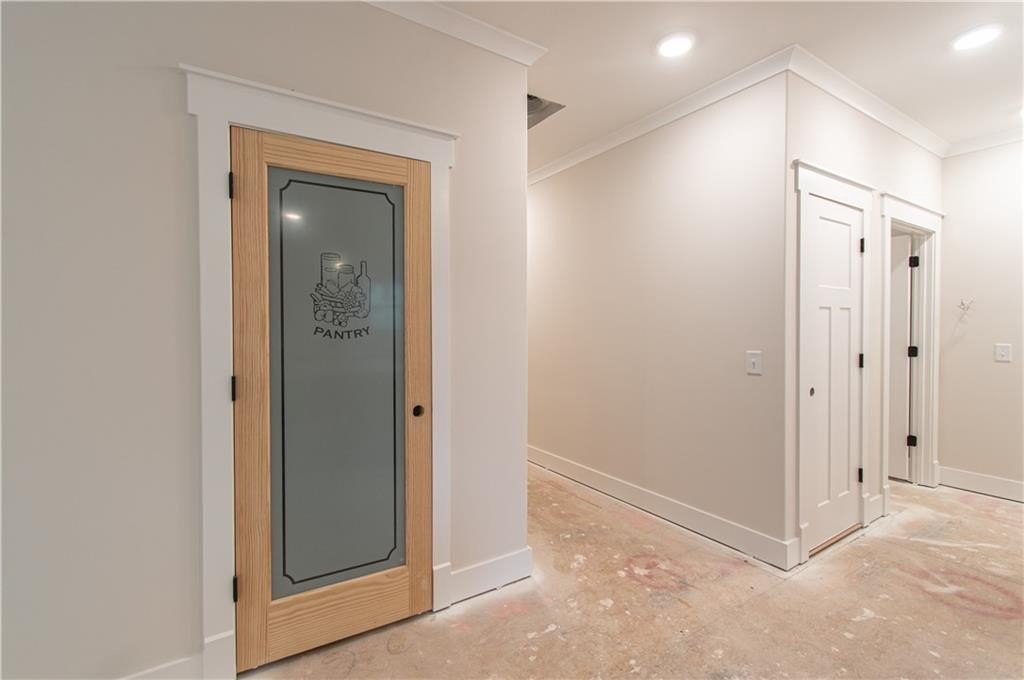 The chef-inspired kitchen boasts solid wood cabinetry with soft-close doors, leather-finished granite countertops, a spacious center island, stainless steel appliances, and a large walk-in pantry with custom shelving and a frosted glass door.