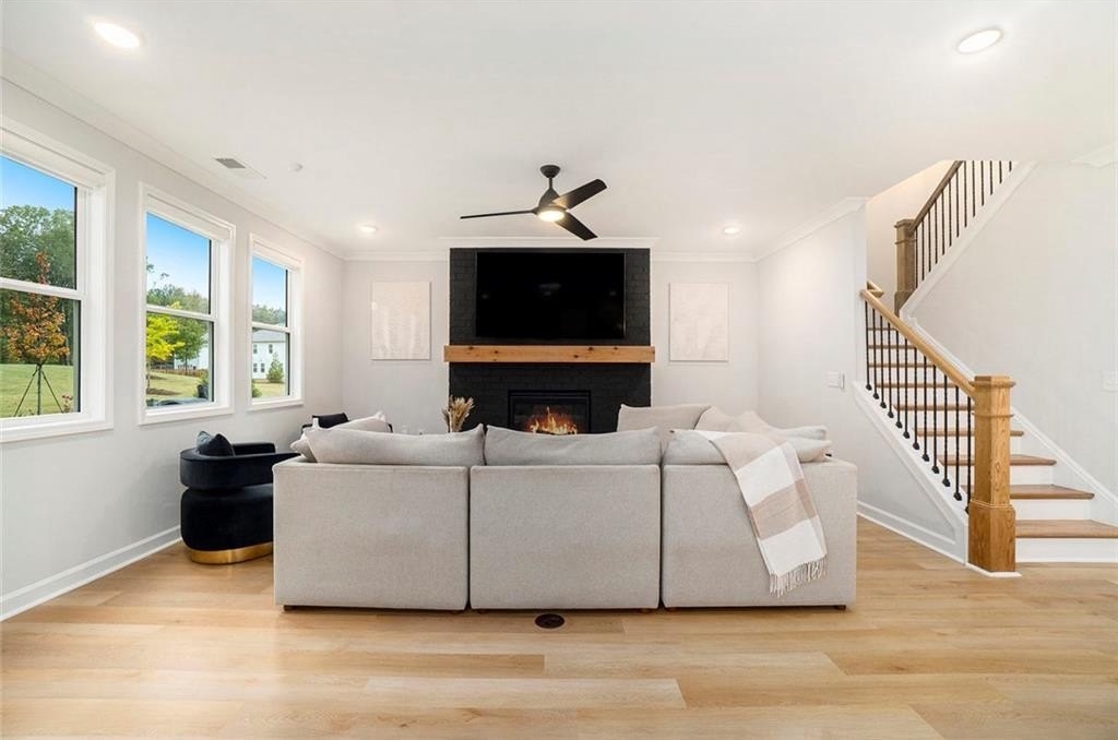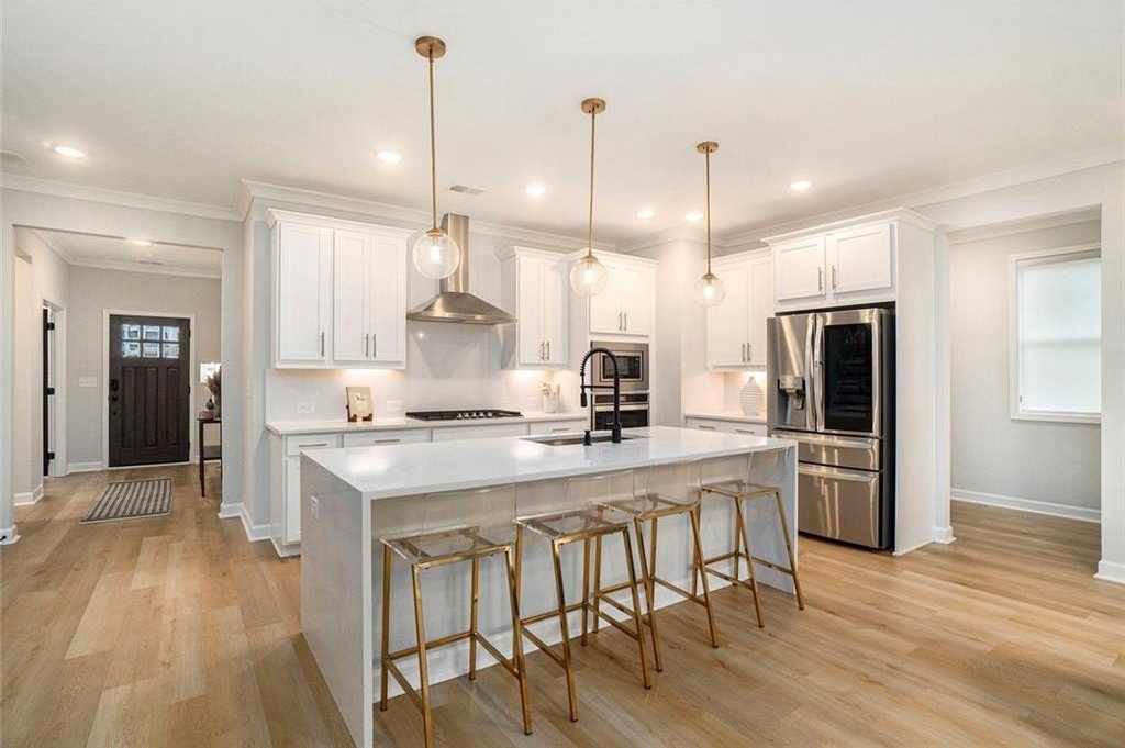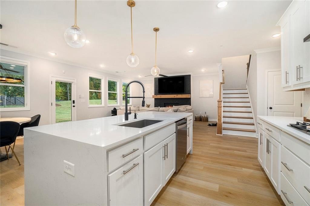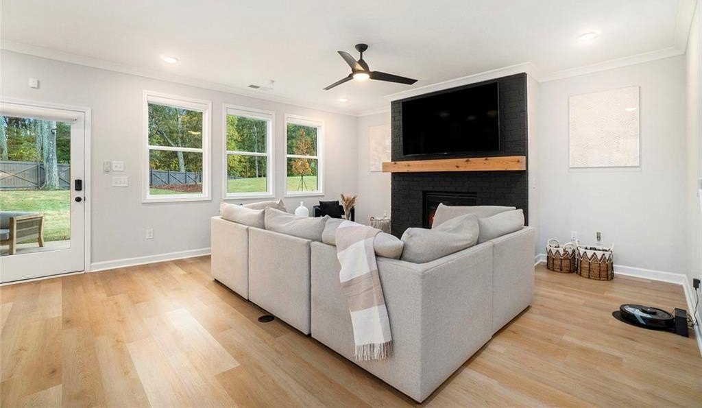 Step inside and experience an open-concept floorplan that blends sophistication and comfort. Designer finishes and thoughtful details create a seamless flow for both entertaining and everyday living. The chef’s kitchen takes center stage with a waterfall island, quartz counters, upgraded cabinetry, and striking lighting that makes every gathering shine. The spacious family room showcases a striking black brick fireplace, custom details, and floor outlets for flexible furniture layouts and effortless entertaining.