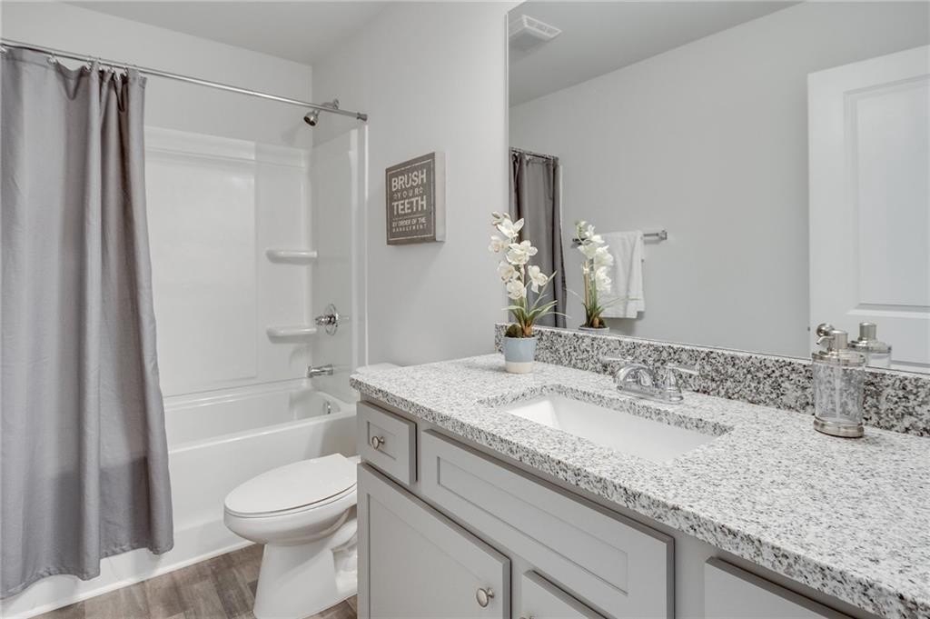 This stunning home showcases beautiful hardwood flooring across the entire main level. Adjacent to the foyer sits a versatile bonus room perfect for use as an office, playroom, formal dining space, or personal retreat. The elegant kitchen features granite countertops, contemporary gray cabinets, and a generous island complete with an undermount sink. The open family room creates an inviting gathering space with its fireplace and dramatic vaulted ceilings.