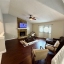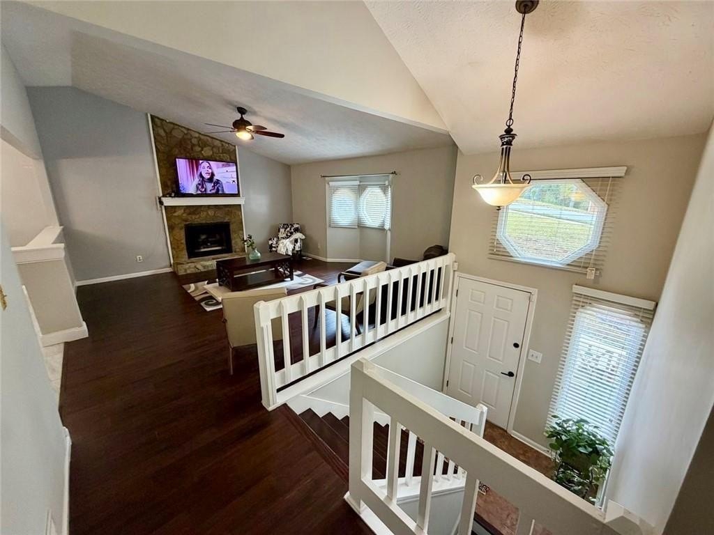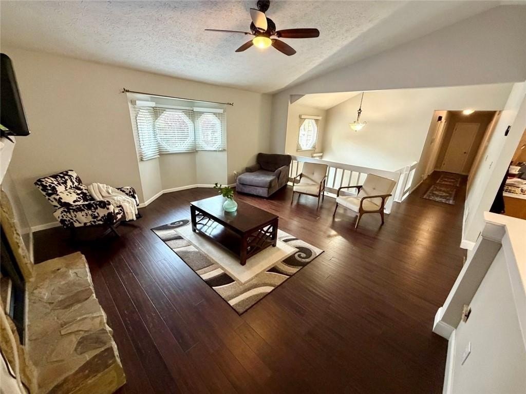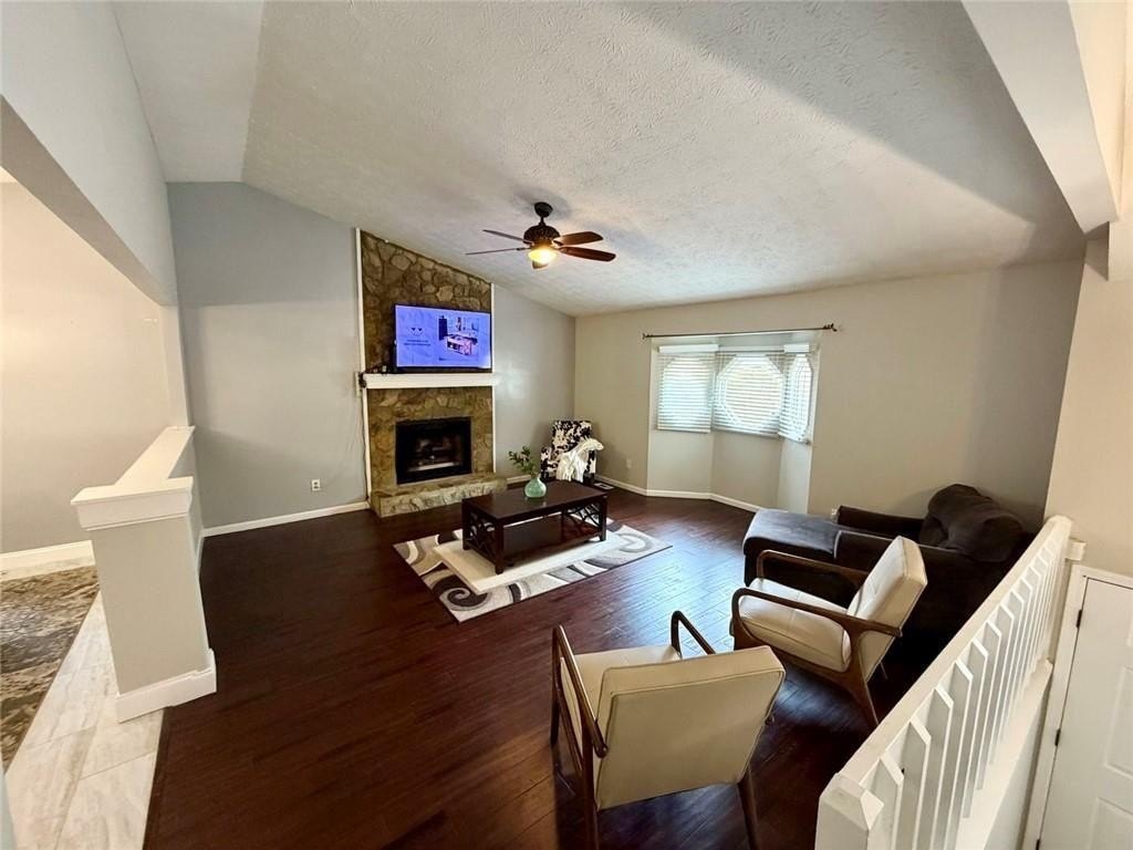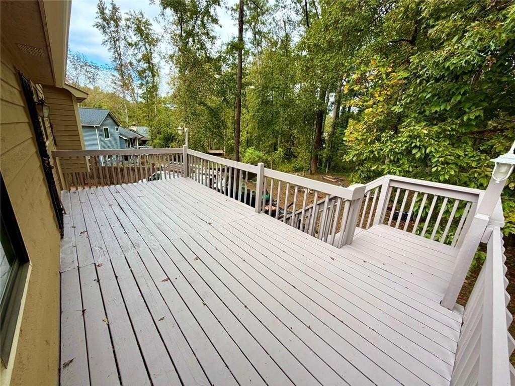 The main level features a large great room with vaulted ceiling, stone fireplace, and hardwood floors throughout. The kitchen overlooks the dining area and opens to a large back deck—perfect for entertaining or relaxing year-round. The main level also includes the primary suite with private bath, two secondary bedrooms, and a full hall bath.