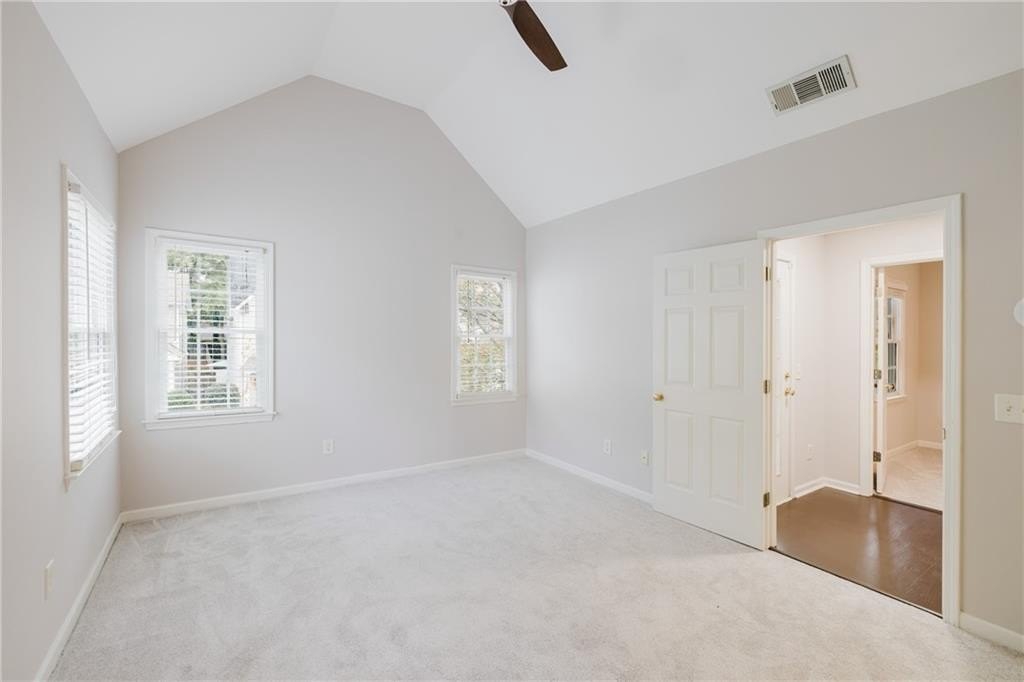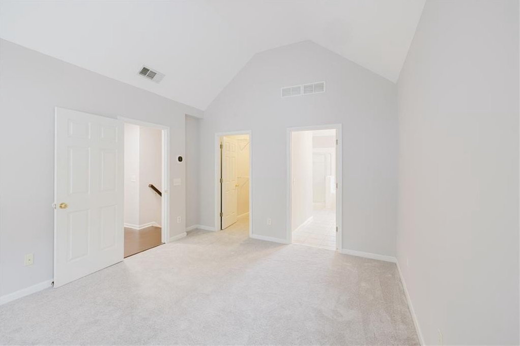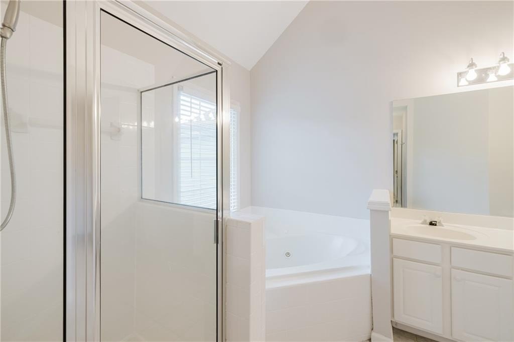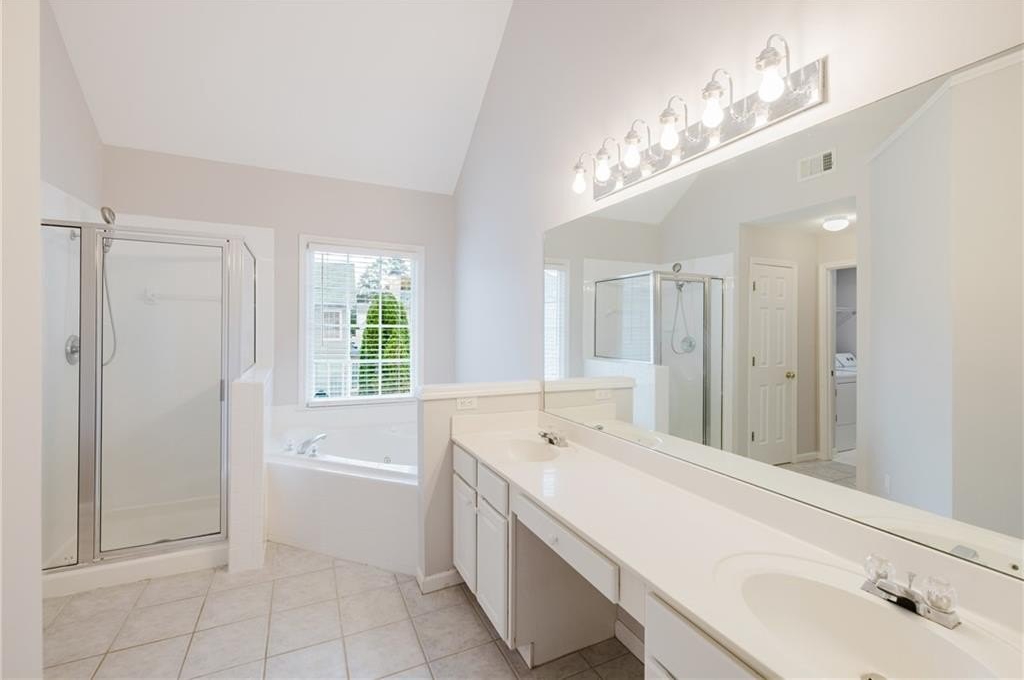 full bath and walk-in closet is also on the main floor. Upstairs includes the spacious primary suite with vaulted ceiling, soaking tub, separate shower, dual vanities, and walk-in closet, plus another bedroom with walk-in closet and a full laundry room. Additional highlights include brand-new carpet upstairs, two new HVAC systems, and a new roof to be installed before closing. The quaint fenced backyard provides a perfect spot for easy outdoor living. Neighborhood amenities