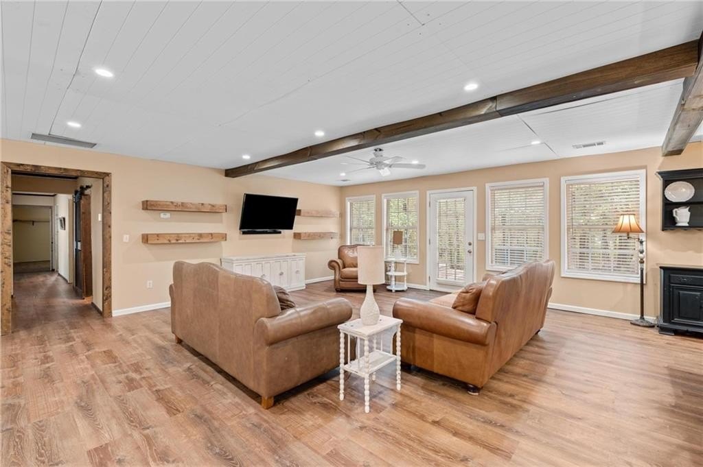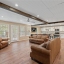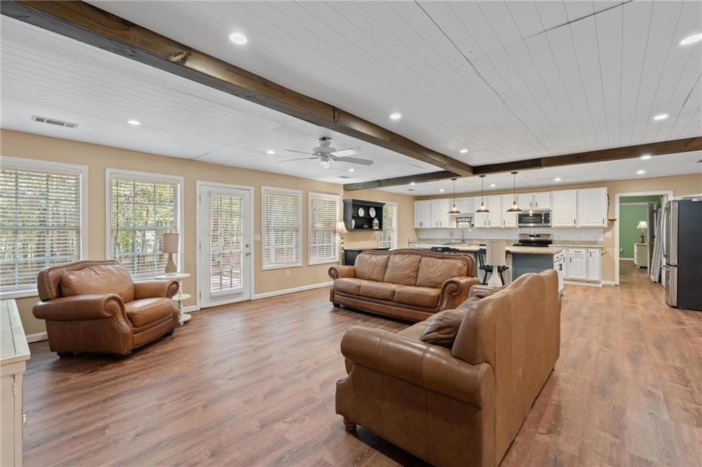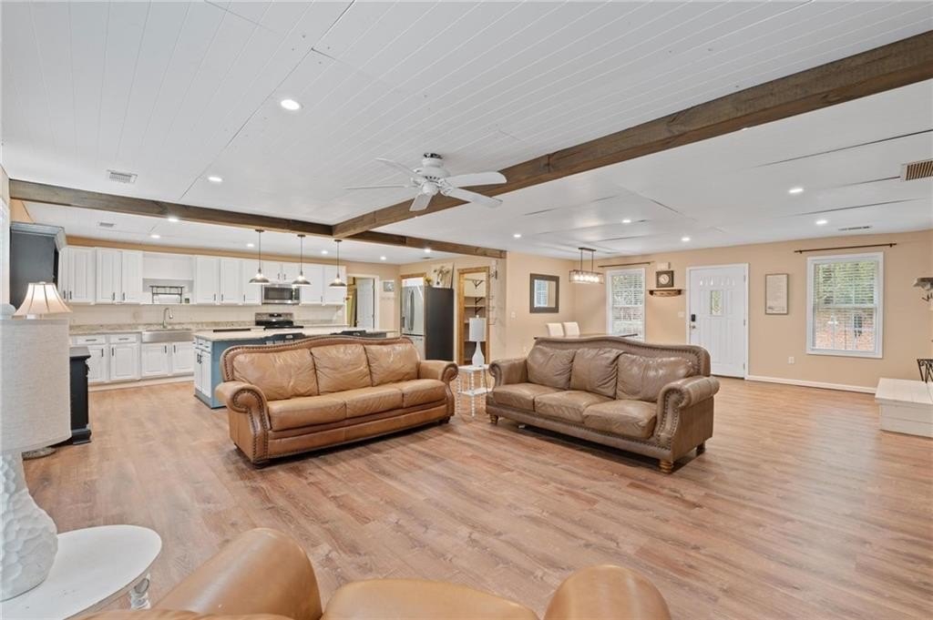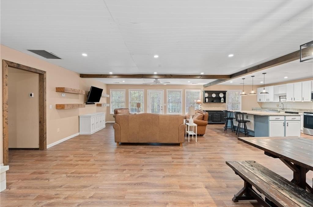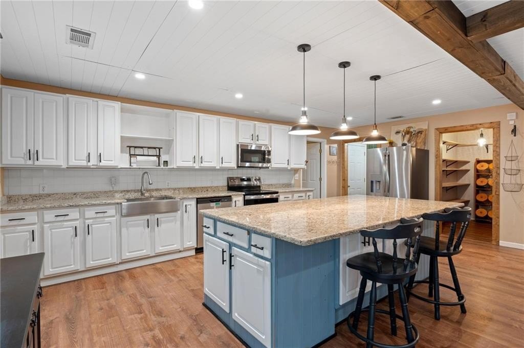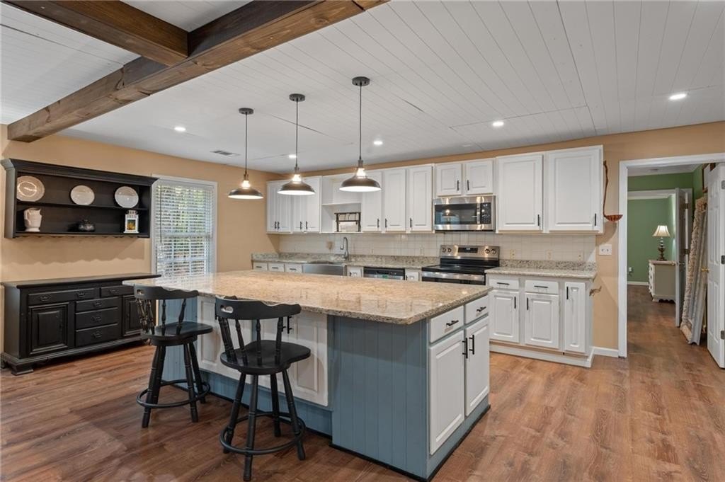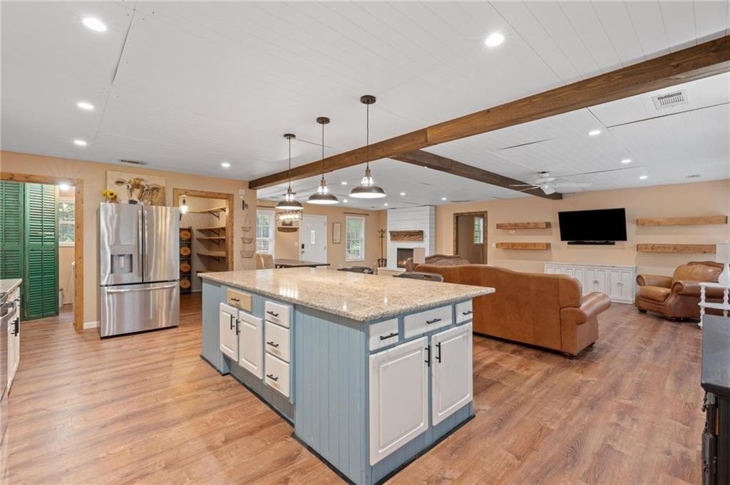 Inside, you’ll find luxury vinyl flooring throughout and an open-concept layout ideal for everyday living and entertaining. The stylish kitchen features white shaker cabinetry, granite countertops, a large island with breakfast bar, and a generous walk-in pantry—all open to the dining area and cozy family room accented by a beamed ceiling.