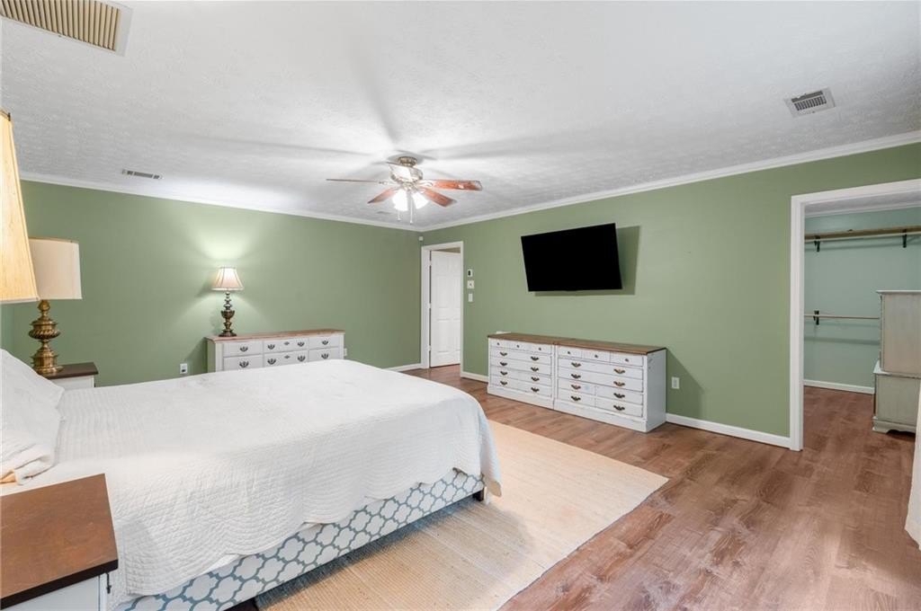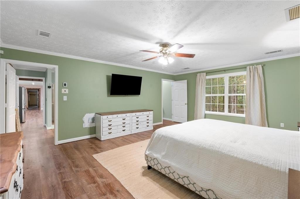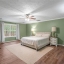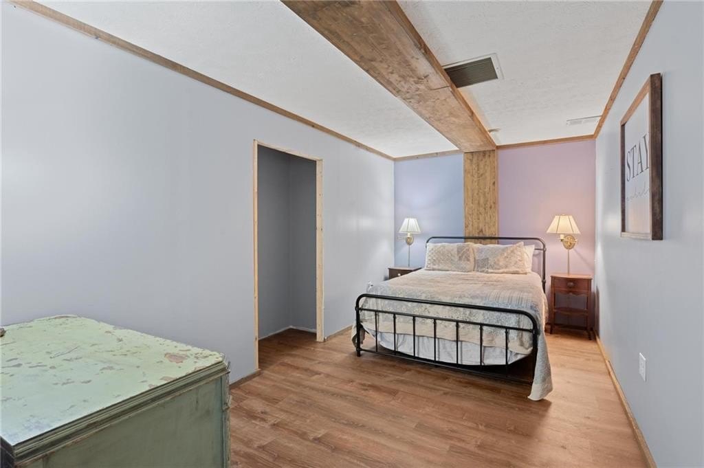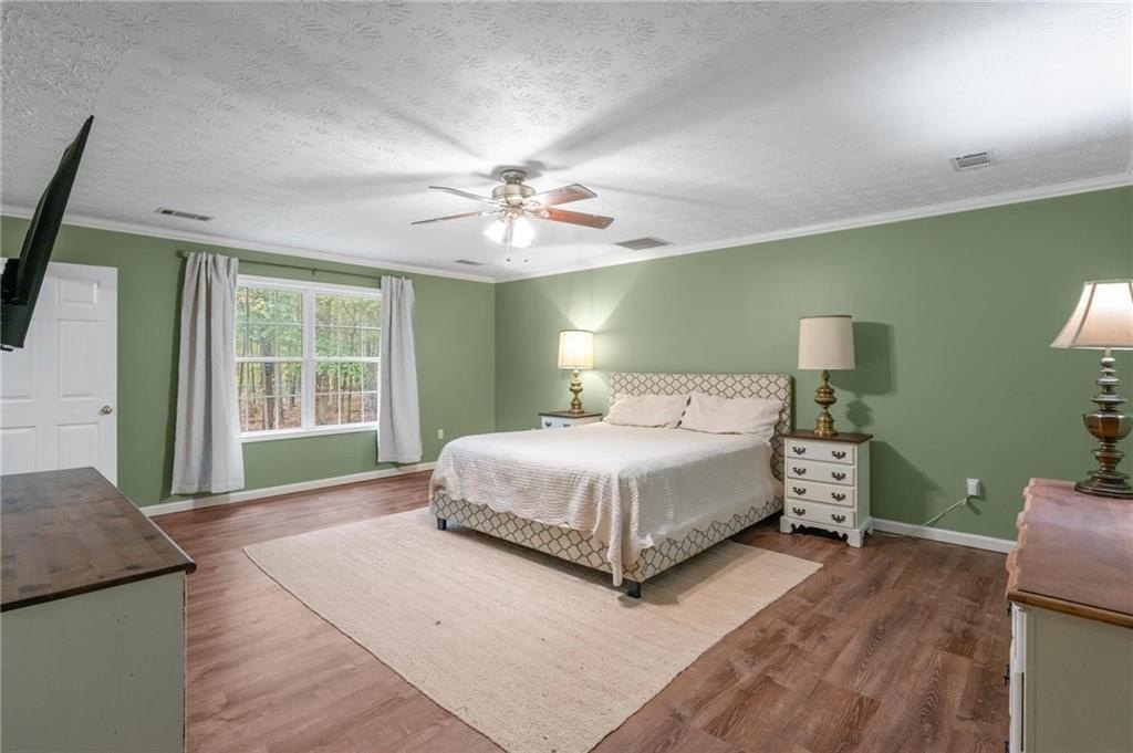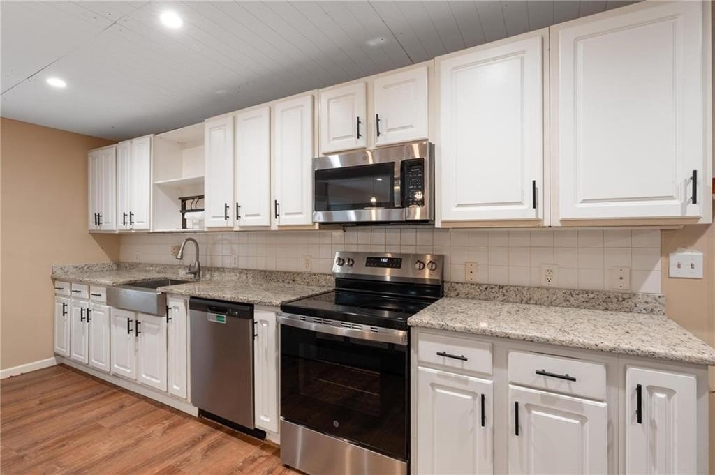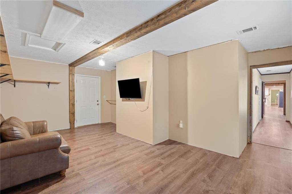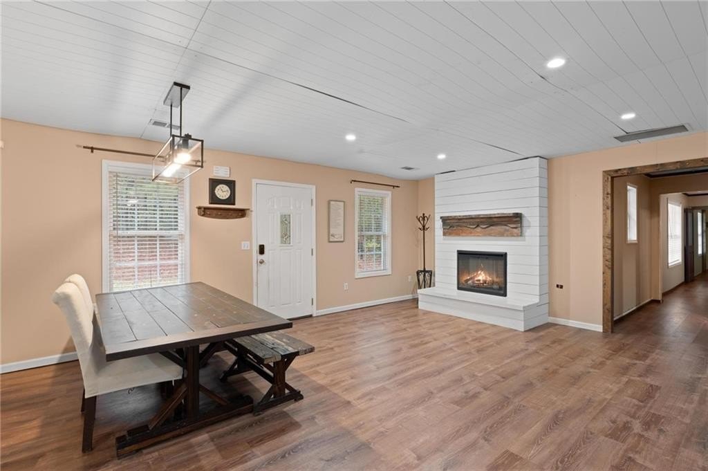 Inside, you’ll find luxury vinyl flooring throughout and an open-concept layout ideal for everyday living and entertaining. The stylish kitchen features white shaker cabinetry, granite countertops, a large island with breakfast bar, and a generous walk-in pantry—all open to the dining area and cozy family room accented by a beamed ceiling.