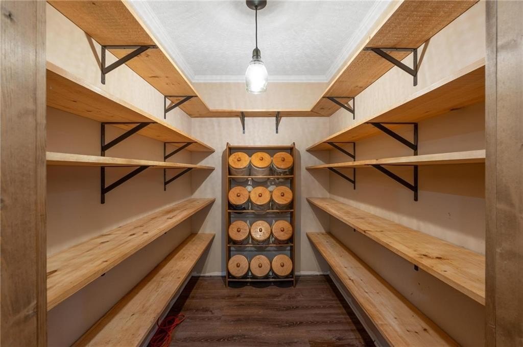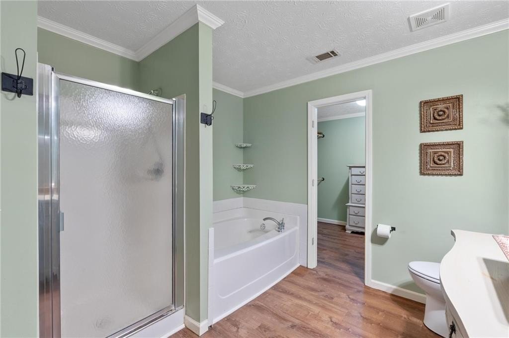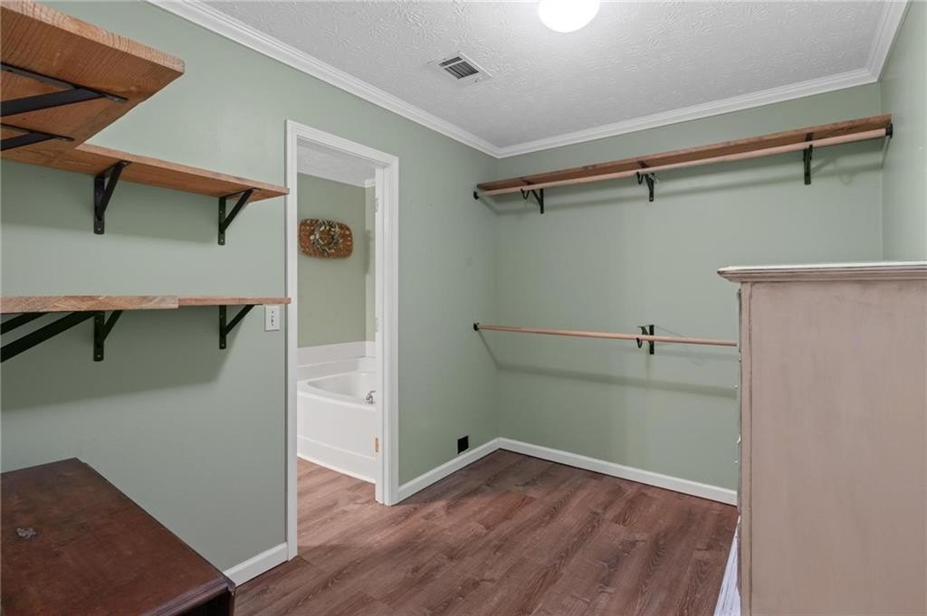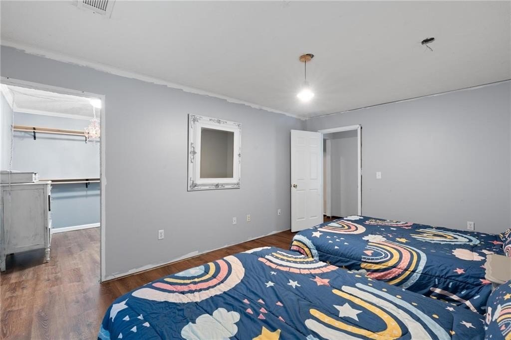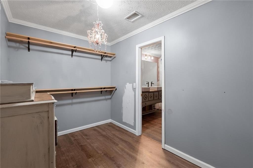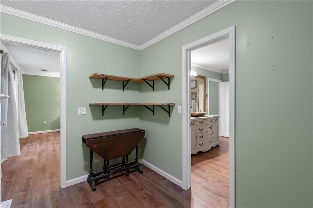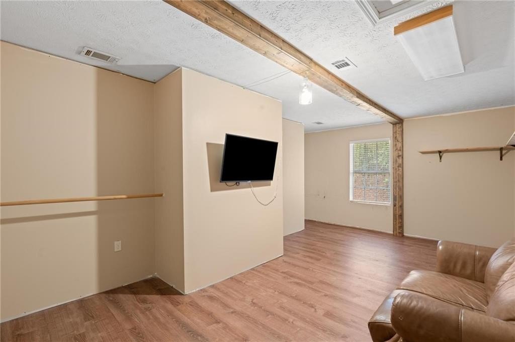 Inside, you’ll find luxury vinyl flooring throughout and an open-concept layout ideal for everyday living and entertaining. The stylish kitchen features white shaker cabinetry, granite countertops, a large island with breakfast bar, and a generous walk-in pantry—all open to the dining area and cozy family room accented by a beamed ceiling.