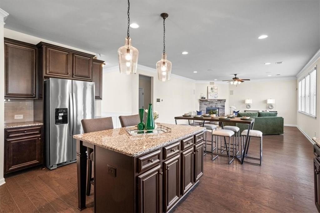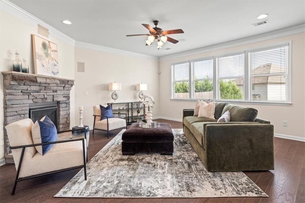 Move-in ready 4-bedroom home in a beautifully maintained community! This spacious home features a flex room, formal dining, and a chef's kitchen with double ovens, gas cooktop, large island, and stone countertops. The oversized primary suite boasts his & hers walk-in closet, double vanities, and a spa-like bath with a garden tub and tiled shower. Enjoy upgrades like whole-house speakers, custom blinds, tray ceilings, and a cozy fireplace in the family room. Step outside to an enlarged covered patio, ideal for relaxing or entertaining. Located in a quiet, established neighborhood just minutes from Conyers shopping, dining, and I-20, with the benefit of lower Newton County taxes. Schedule your private showing today. This one won't last!