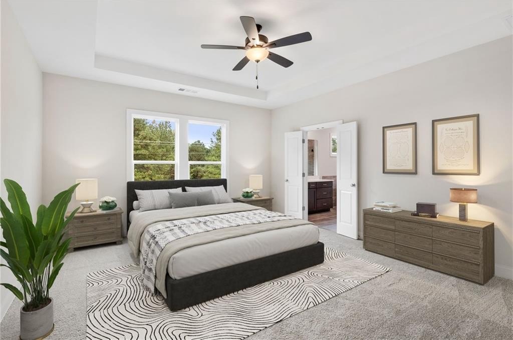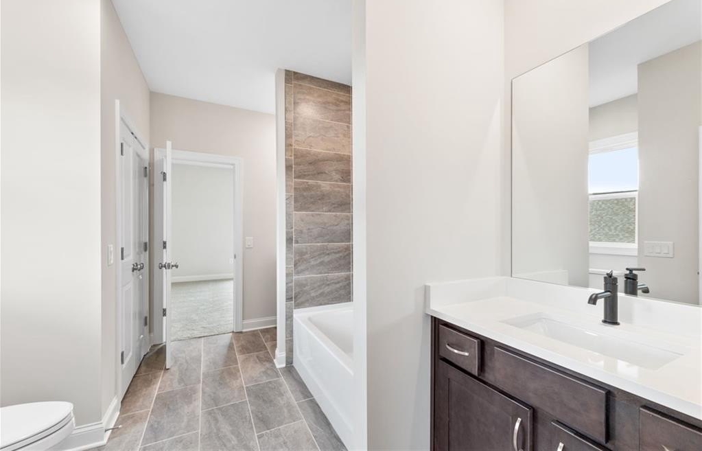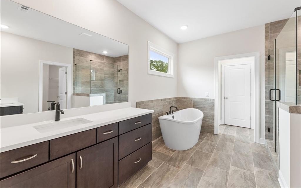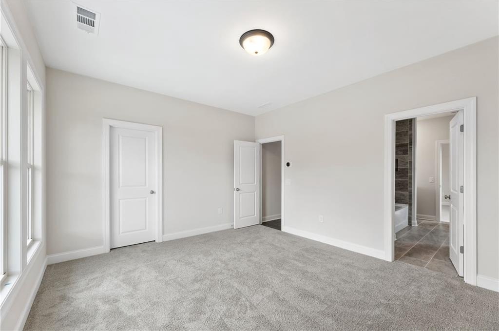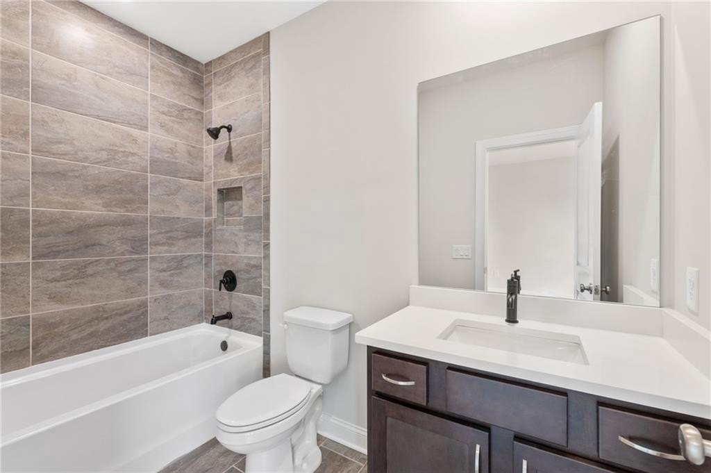 READY NOW. Windsong's Wesleyan A plan—a 5-bedroom, 4-bath home thoughtfully designed with over 3,100 sq ft of upscale comfort in Ashbury Commons, a boutique West Cobb community. Step inside and be welcomed by warm Cinnamon Walnut flooring, rich Charcoal cabinetry, and a dramatic stacked mosaic backsplash that sets the tone for the gourmet kitchen. This kitchen is made for entertaining and features Viatera White Pearl quartz countertops, matte black accents, and stainless Frigidaire Gallery appliances. A private guest suite on the main floor offers flexibility, while the upstairs primary retreat stuns with a freestanding tub, bold black fixtures, and soothing Paradise Grey tilework. Every bathroom is a showcase of designer-selected quartz, tile, and hardware—creating spa-like moments throughout.