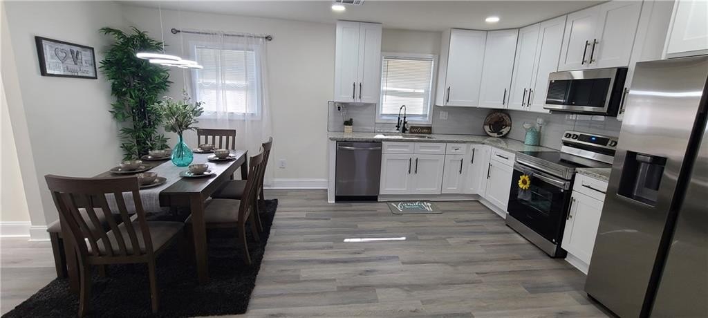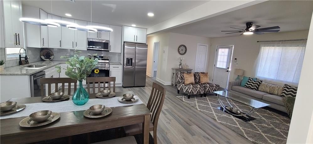 Step inside to an open-concept living, dining, and kitchen area featuring stainless steel appliances, stunning quartz countertops, and modern fixtures that make this space both stylish and functional.