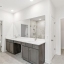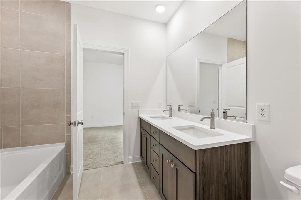 Luxury features in these homes include oversized kitchen islands with quartz countertops, 42-inch cabinets, and spacious walk-in pantries. The primary bedrooms boast tray ceilings and generously sized walk-in closets. The primary bathrooms come equipped with a free-standing tub and comfort-height toilets, along with quartz countertops in both the primary and secondary baths. Raised-height vanity cabinets and white rectangular undermount sinks add a touch of elegance.
