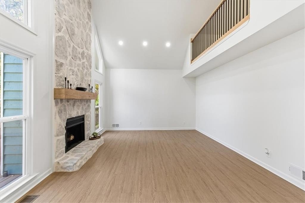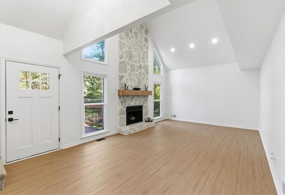 Step inside to a bright 2-story living room with a stunning floor-to-ceiling stone fireplace, overlooked by an upstairs loft. The gourmet kitchen is a chef’s dream, featuring brand-new stainless steel appliances, quartz countertops, a large island, and plenty of space for entertaining. The kitchen and dining area flow seamlessly to the oversized back deck with peaceful views of the private backyard.