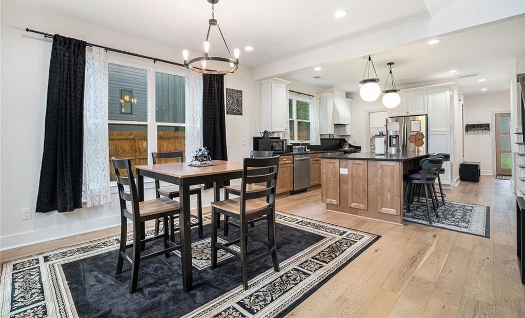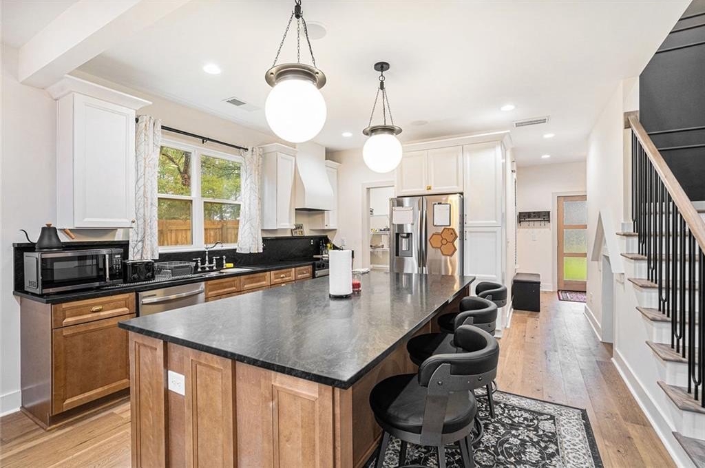 Step into 2,333 square feet of open-concept perfection. The dramatic two-story living room features custom millwork, a brick fireplace, and abundant natural light. The chef’s kitchen stuns with an 8-foot island, designer vent hood, quartz counters, walk-in pantry, and elegant wood cabinetry — perfect for hosting or daily life.