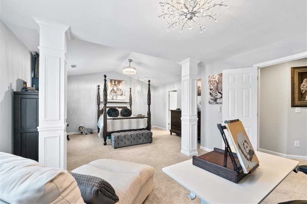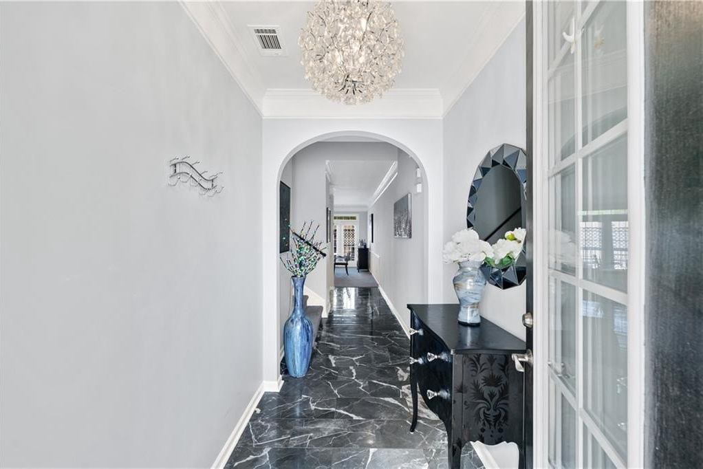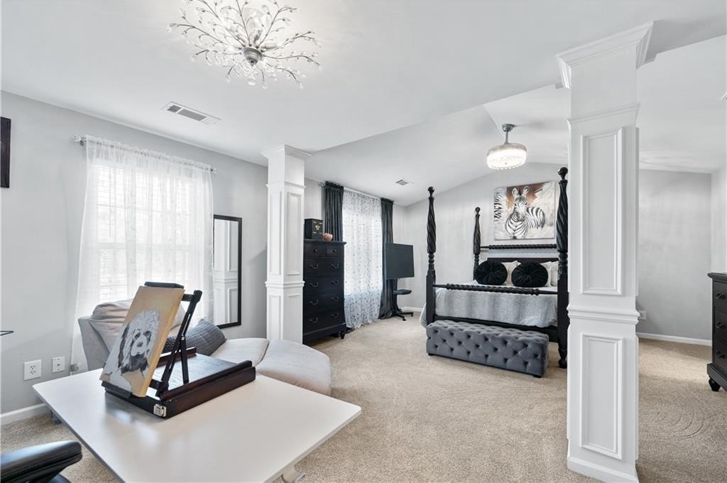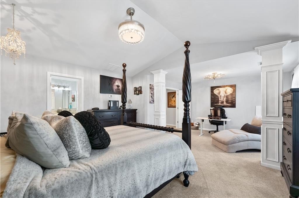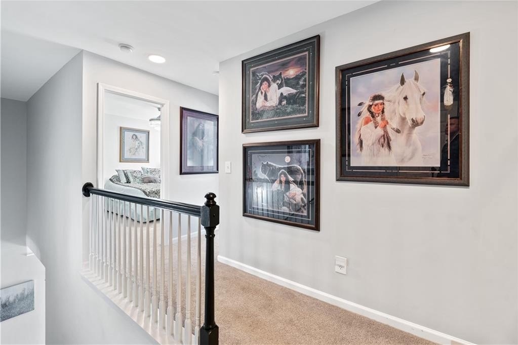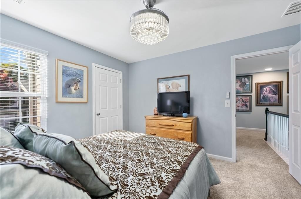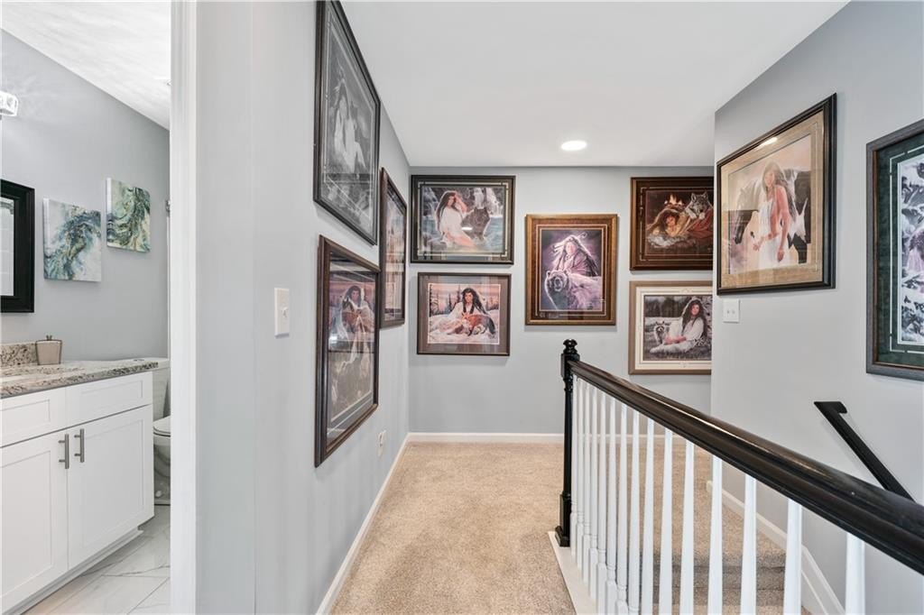 There are 2 additional bedrooms upstairs, both large enough for queen size beds and furnishings. One has a vaulted ceiling with a crystal fandelier and walk-in closet. Upstairs the hallway makes for a fabulous gallery wall. A must see!