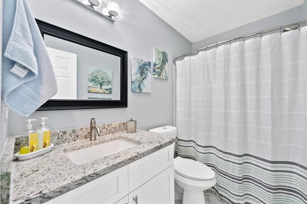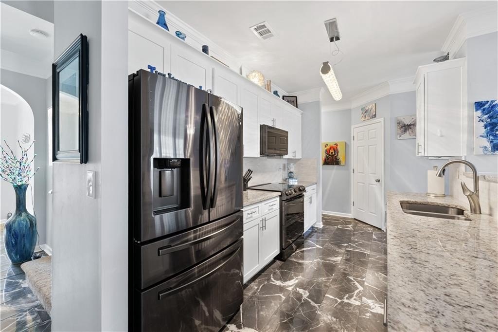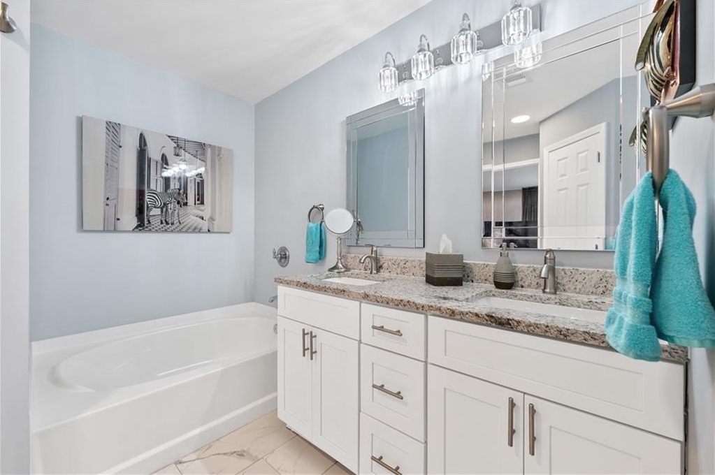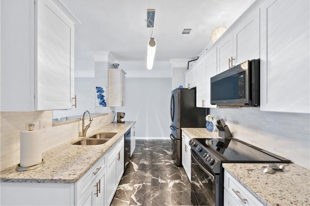 The modern galley kitchen has all the space you need with new white cabinets, beautifully appointed with granite countertops and bar for entertaining. The kitchen is State of the art, with new Samsung appliances in sleek black stainless steel. You will enjoy the touchless Kohler sink connected to a dedicated outlet.