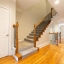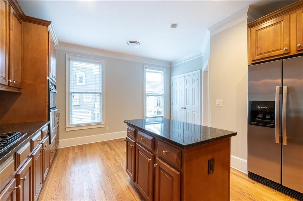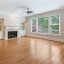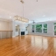 The main level welcomes you with a flowing, open layout highlighted by rich hardwood flooring and detailed crown molding that spans the entire level. The spacious living area centers around a fireplace flanked by built-in shelving and integrated audio. The chef's kitchen is appointed with granite surfaces, a generous center island, premium stainless appliances including a gas cooktop, custom cabinetry with stain finish, a pantry, and casual dining options. A separate formal dining area connects seamlessly to both the kitchen and living spaces, and onto an elevated deck overlooking wooded surroundings - perfect for outdoor relaxation and dining. A powder room rounds out this level.