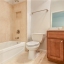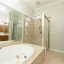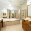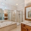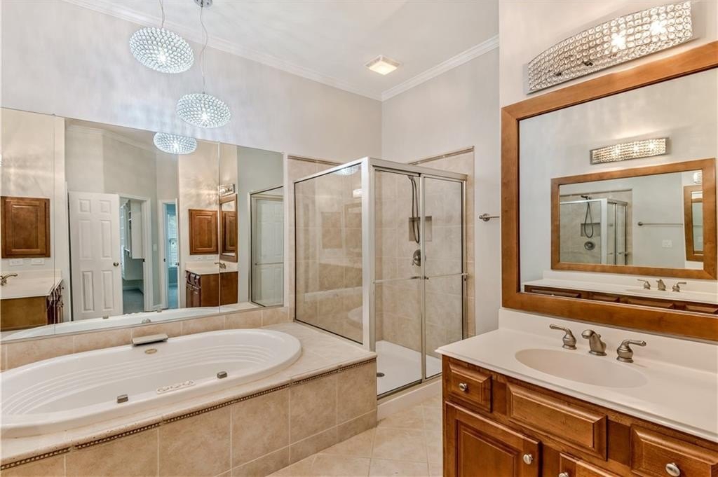 Upstairs, the owner's suite impresses with cathedral ceilings. The private bathroom evokes a spa experience with his-and-her sinks, a deep soaking whirlpool tub, a glass shower, and a generous, custom walk-in closet. Two additional well-proportioned bedrooms share a full hallway bathroom (with one offering direct access), and the laundry facilities are conveniently located on this floor.