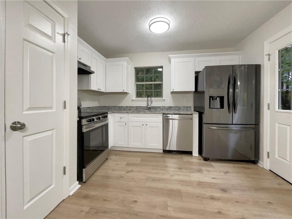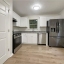 into the eat-in kitchen—complete with all-white cabinetry, brand new