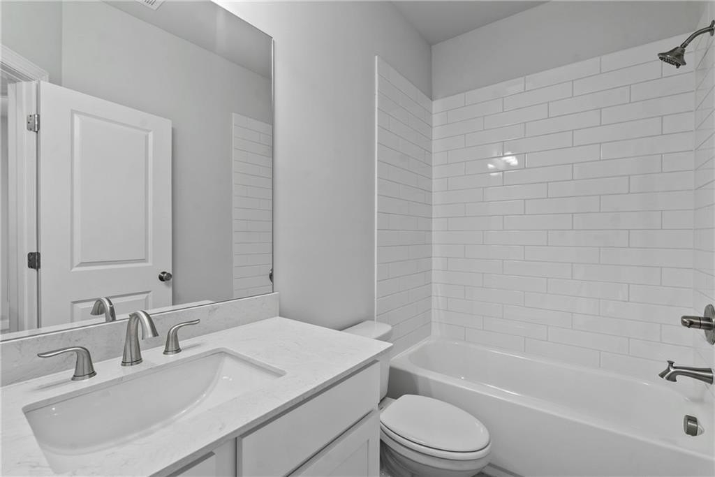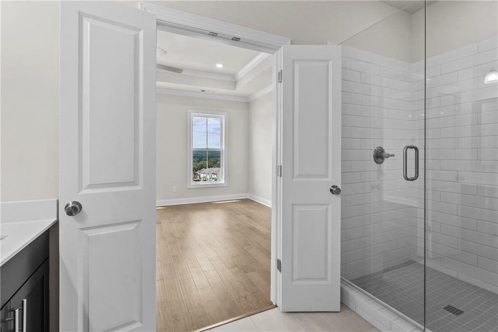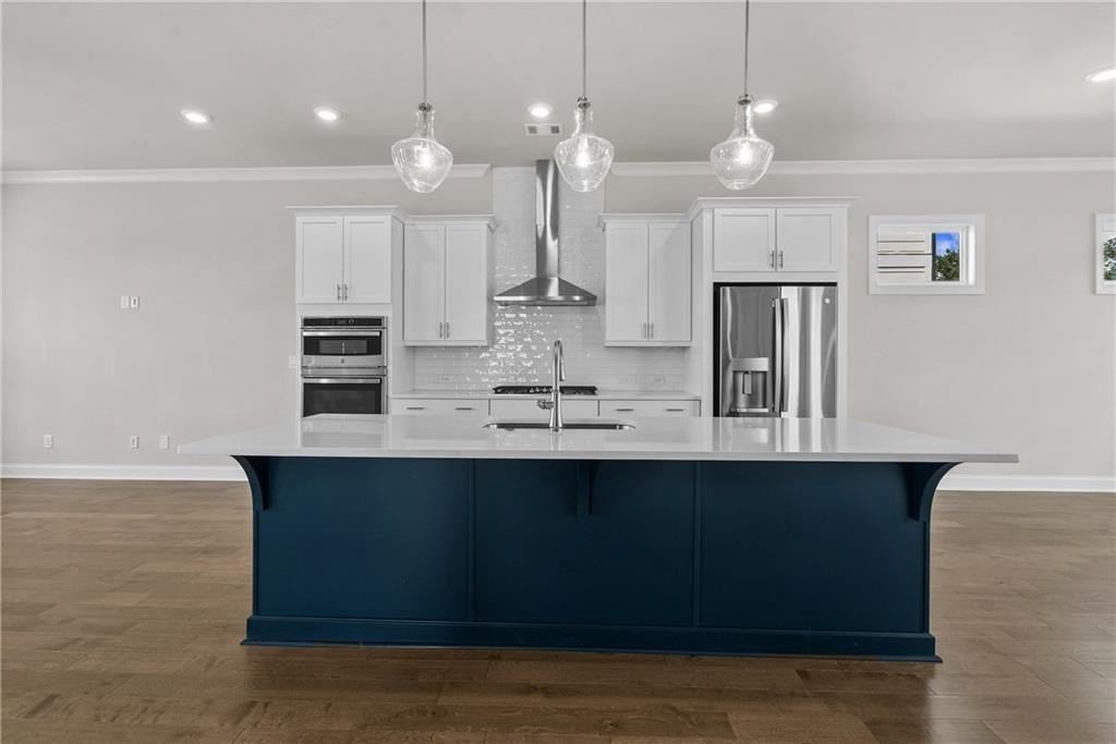 On the main floor, natural light pours through oversized windows, creating a warm and inviting ambiance. The family room seamlessly connects to a charming Charleston-style front porch, ideal for enjoying morning coffee or evening breezes. A gourmet kitchen awaits, complete with 42” soft-close cabinetry, under-cabinet lighting, quartz countertops, and premium stainless steel appliances. Adjacent to the kitchen, the dining area opens to a covered deck—perfect for outdoor dining or peaceful relaxation overlooking the landscaped backyard.