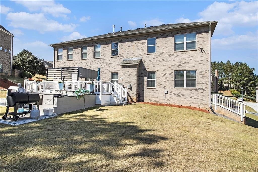 Enjoy the spacious backyard with a full deck and patio, surrounded by lush landscaping, colorful flowers, and palm trees—creating a serene outdoor setting.