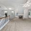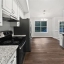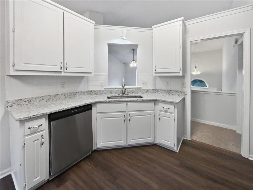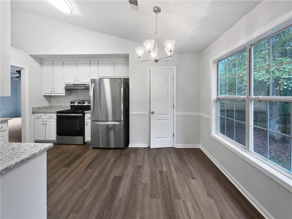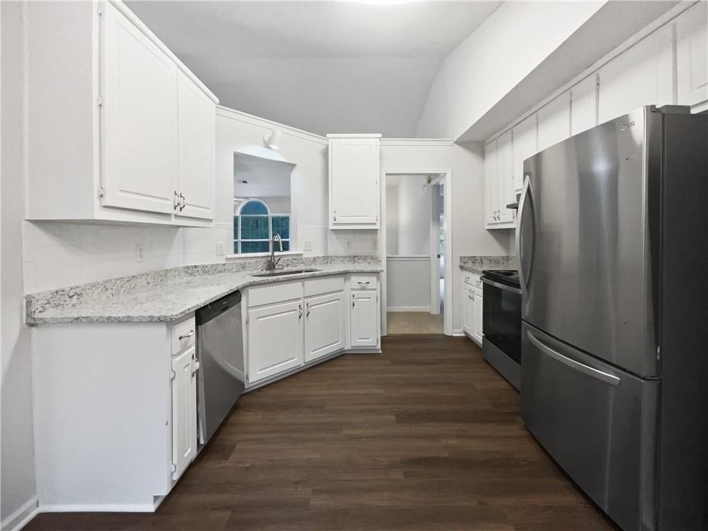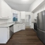 ceilings opens to a white eat-in kitchen with quartz countertops and brand-new stainless