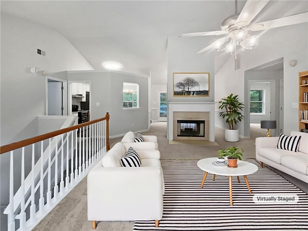 stylish as it is practical! The bright, airy living room with a modern fireplace and soaring