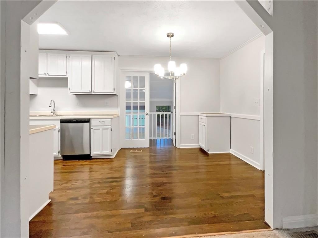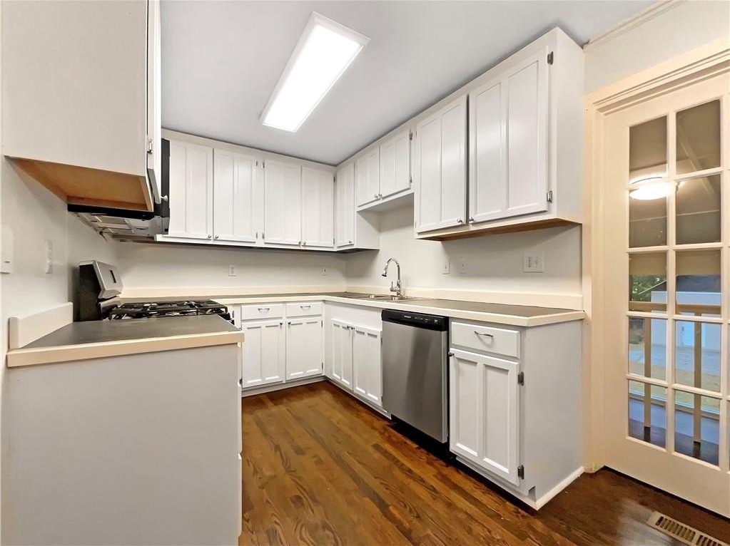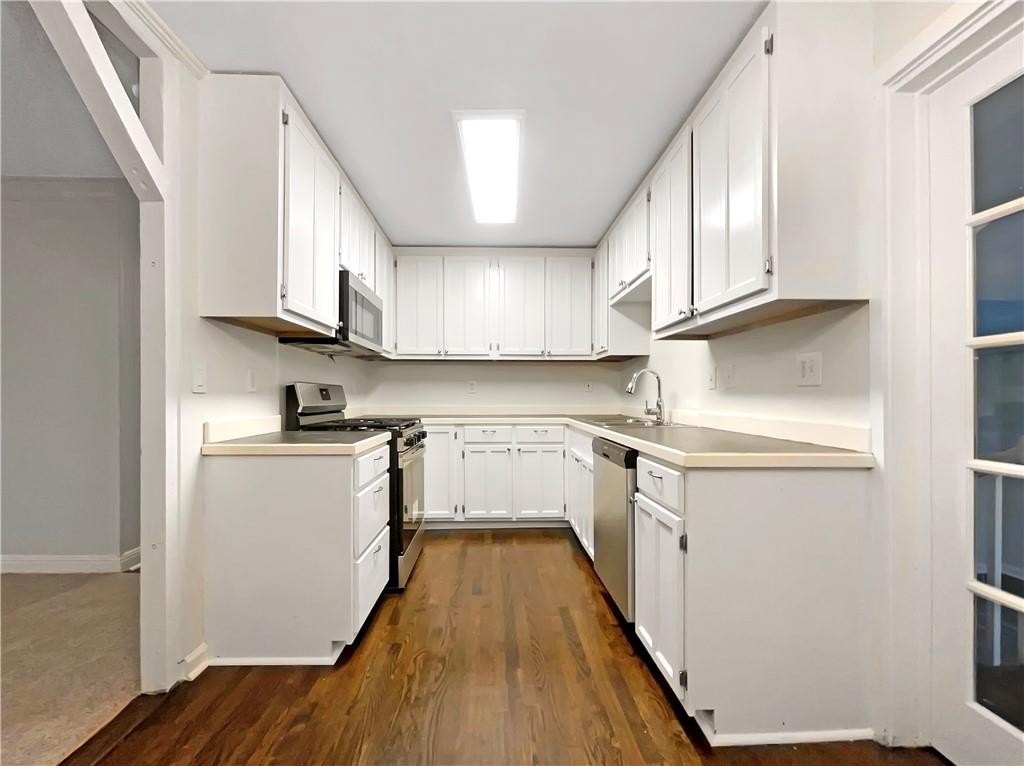 and an updated all-white kitchen with new stainless steel appliances and great flow for