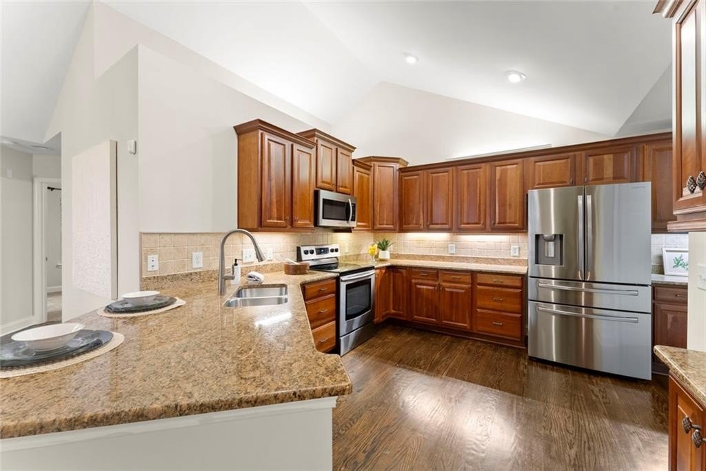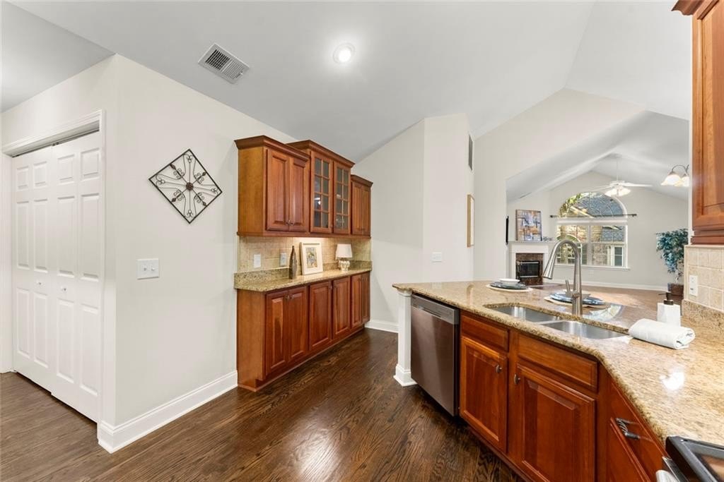 You’ll fall in love with the vaulted, high ceilings and the gorgeous natural light streaming through the home’s many windows, creating an open, airy feel throughout. The fantastic kitchen is the heart of the home, complete with granite countertops, smooth ceilings, ample cabinetry, two pantries, and plenty of storage for the home chef.