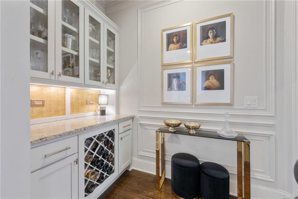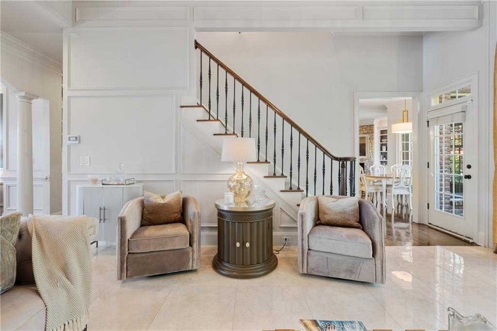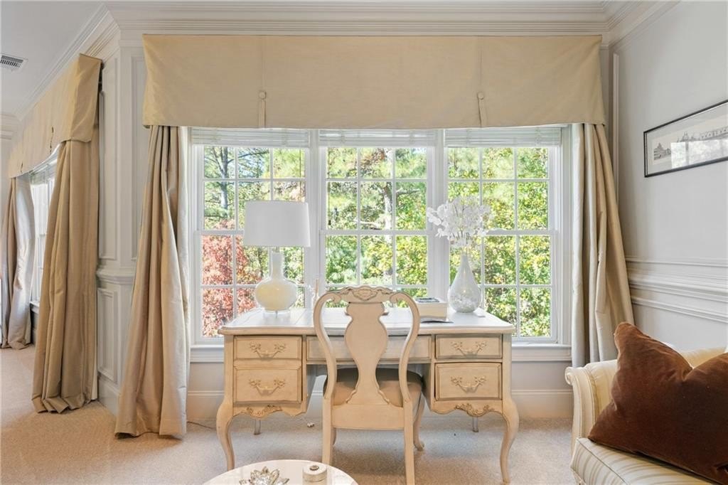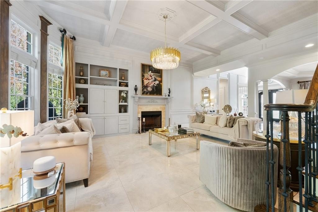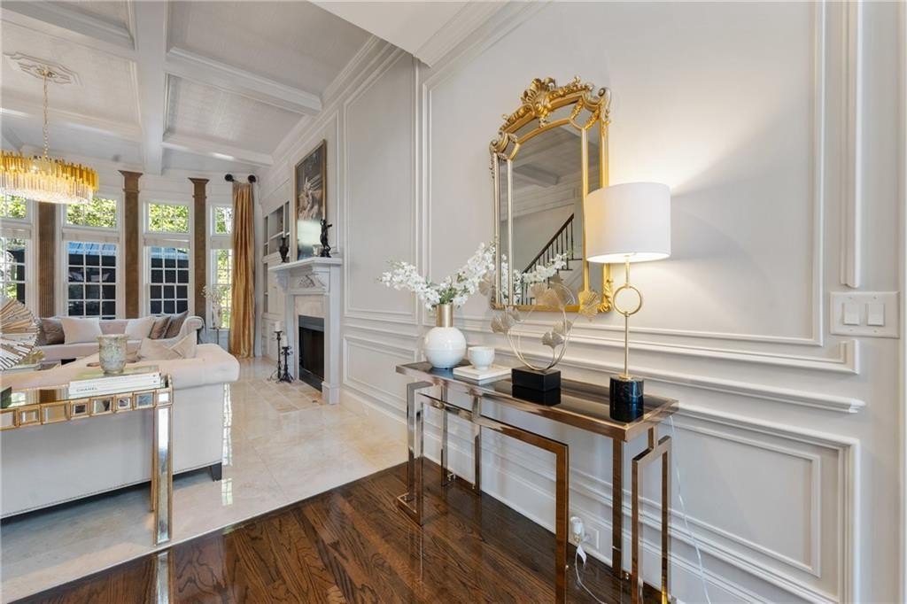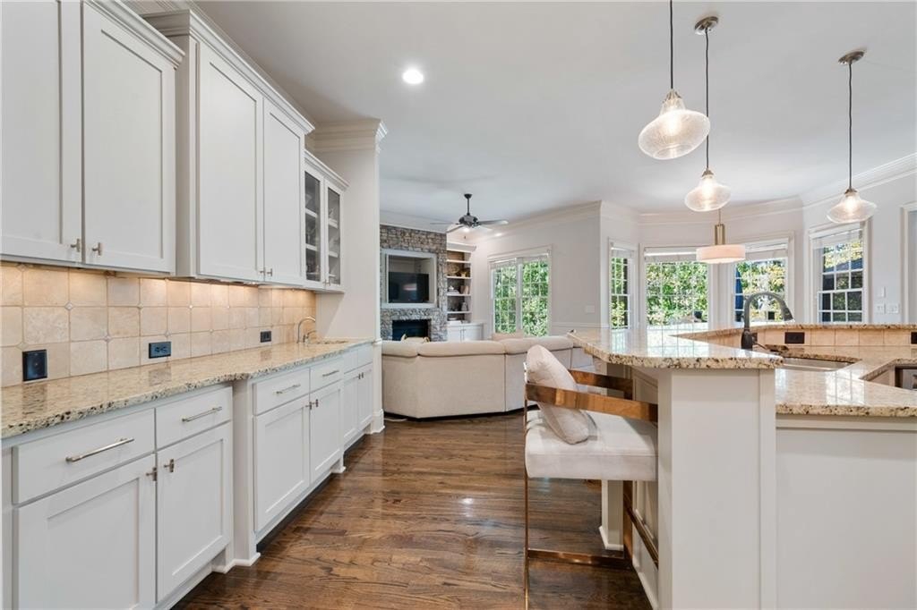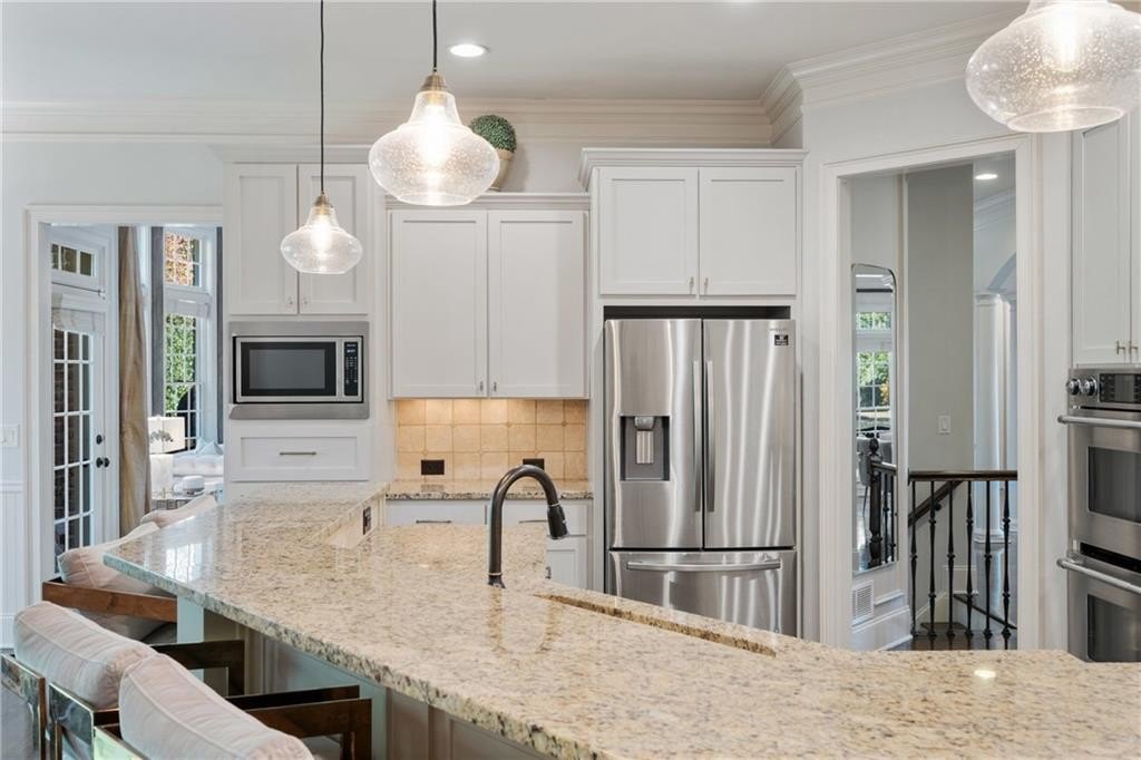 Step through the stunning new wrought iron double door entry into the grand two-story foyer. The main level features refinished hardwood floors, a formal dining room with floor-to-ceiling windows and custom millwork, and a bright great room with a wood-burning fireplace, coffered ceilings, and gorgeous floors. The gourmet kitchen is a showstopper—offering abundant custom cabinetry with new hardware, granite counters, stainless steel appliances, double ovens, two pantries, new pendant lighting, and a custom wine and coffee bar. The open layout flows seamlessly into the sunlit keeping room, complete with built-ins and a cozy gas fireplace. A dedicated office with double-door entry and a guest suite with a fully renovated bath complete the main level.