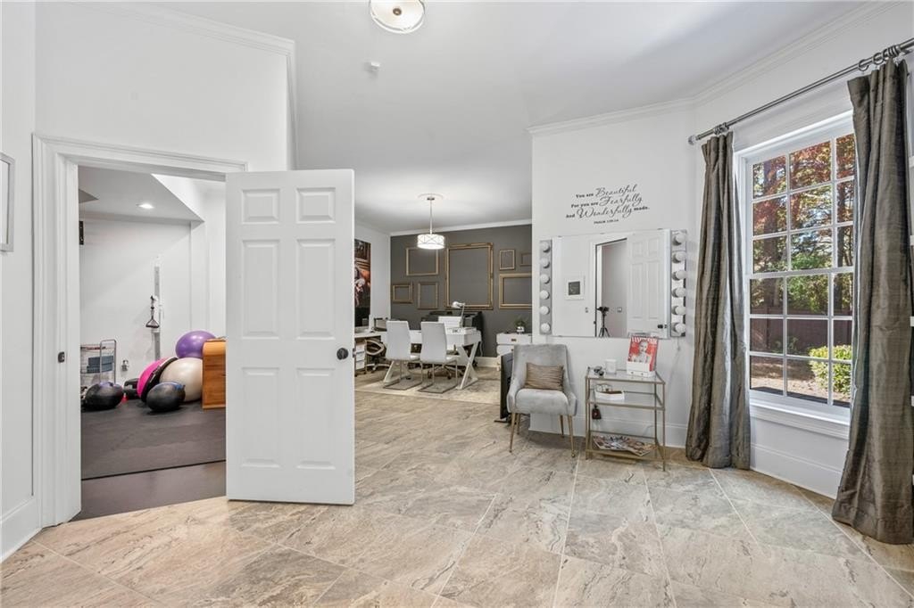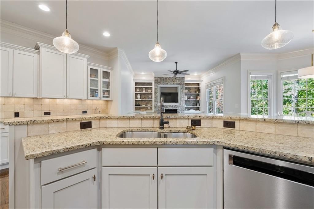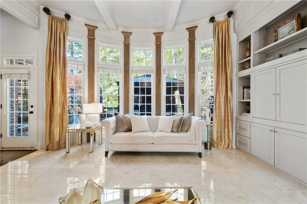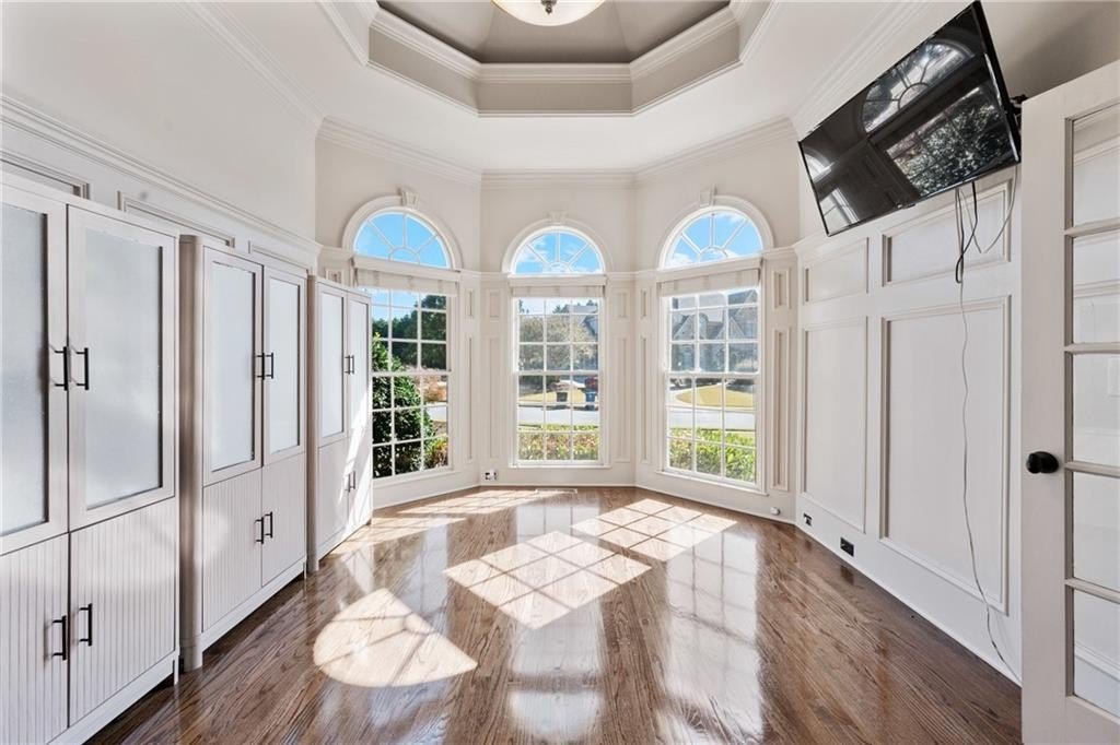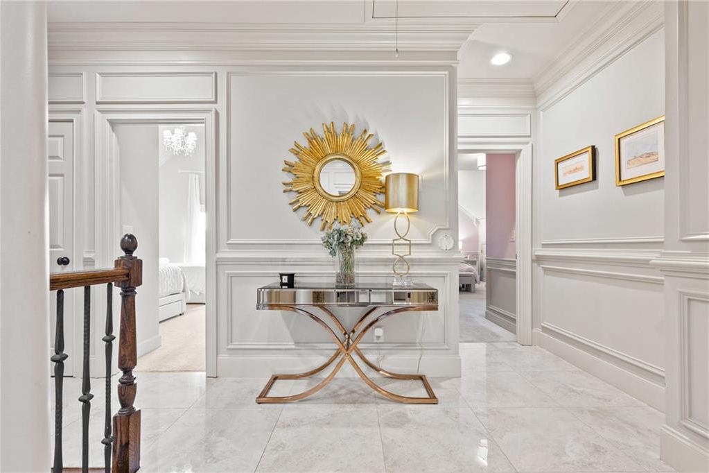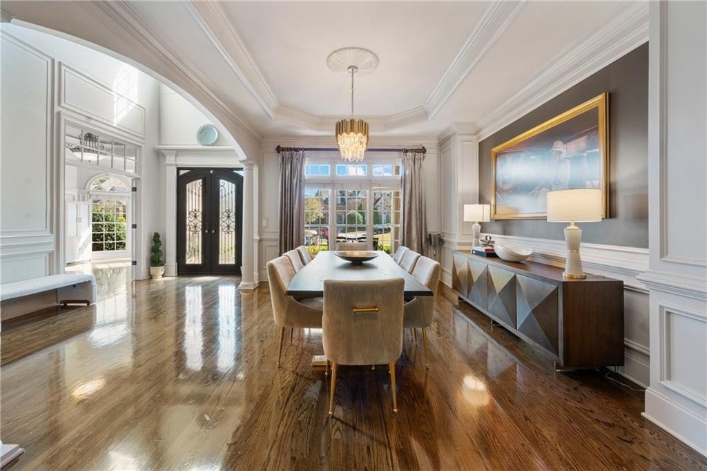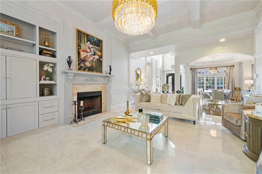 Step through the stunning new wrought iron double door entry into the grand two-story foyer. The main level features refinished hardwood floors, a formal dining room with floor-to-ceiling windows and custom millwork, and a bright great room with a wood-burning fireplace, coffered ceilings, and gorgeous floors. The gourmet kitchen is a showstopper—offering abundant custom cabinetry with new hardware, granite counters, stainless steel appliances, double ovens, two pantries, new pendant lighting, and a custom wine and coffee bar. The open layout flows seamlessly into the sunlit keeping room, complete with built-ins and a cozy gas fireplace. A dedicated office with double-door entry and a guest suite with a fully renovated bath complete the main level.