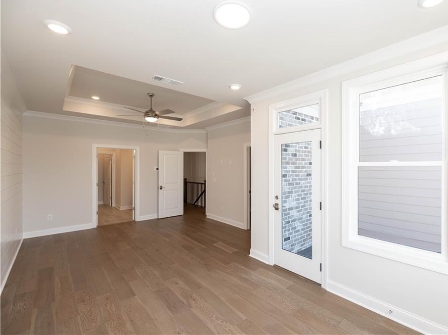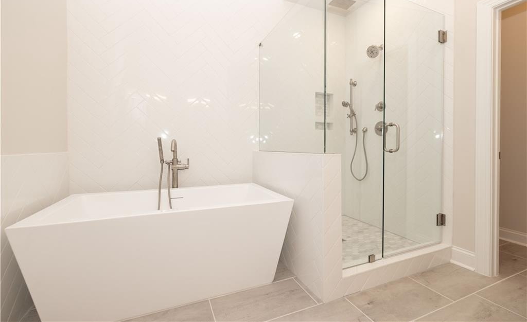 The Chamberlain offers an open concept plan where architectural design meets timeless sophistication featuring 10-foot ceilings and hard surface flooring on the main level, stairs and hallways, 9 foot ceilings on the terrace and 3rd levels. Elevated all brick exteriors with charming brownstone and terrace styles front entrances, creating an exquisite and welcoming feel. The spacious and stunning kitchen layout showcases GE stainless steel appliances with slide-in gas ranges with stainless steel vent hoods, 42" stacked cabinets with upgraded backsplash options, and oversized kitchen islands with upgraded Quartz tops. The spacious dining room/ family room space is ready for you to add a bar area complete with cabinets, floating shelves and beverage refrigerator for a perfect entertaining space. The family room features a sleek linear fireplace with mantel space to add floating shelves, a cabinet and be able to add your own design selected finish surround with matching mantle Walk down to the terrace-level suite where you find a serene bedroom retreat with full bathroom with an elegantly upgraded walk-in shower, perfect for guests or multi-generational living. The upper-level owner's suite exudes tranquility, with an expansive sitting area that leads to your own private outdoor deck. Enjoy your spa-inspired bath featuring a freestanding soaking tub, with a walk-in shower, and refined finishing hardware touches and framed mirrors. The secondary bedroom on the third floor include an ensuite full bathroom and upgraded countertops.