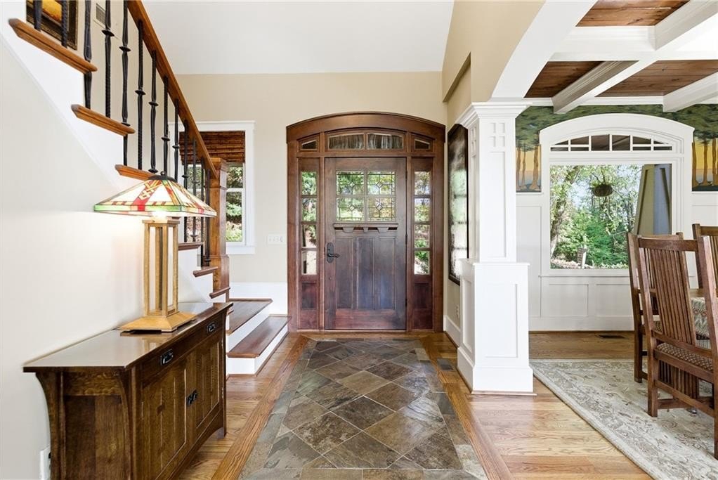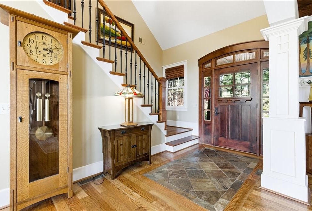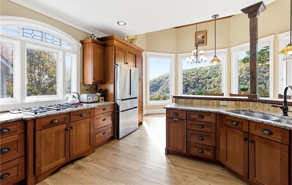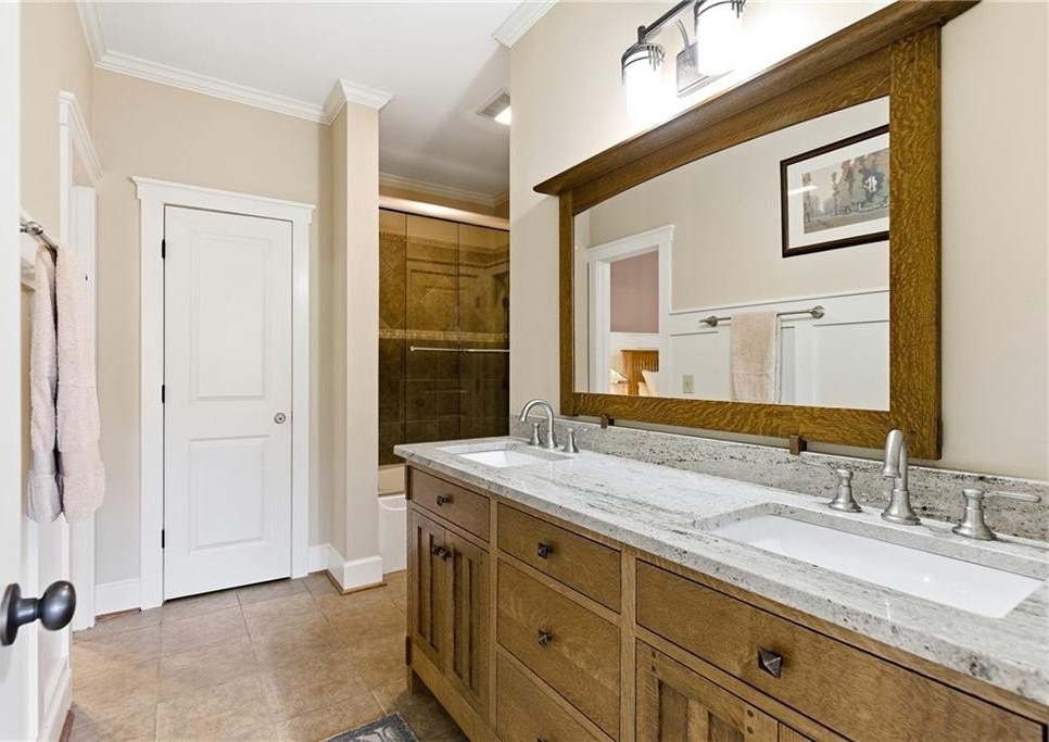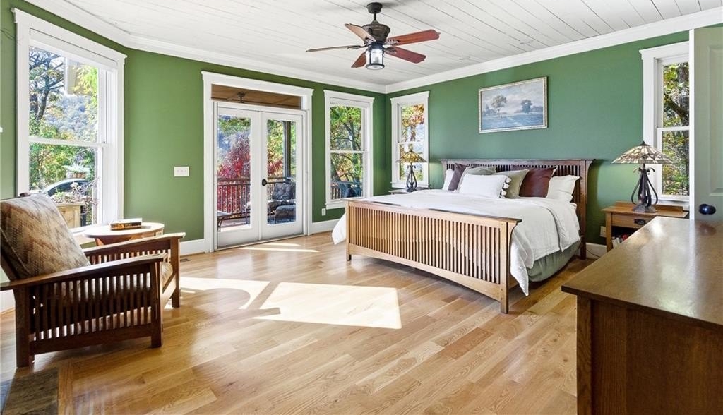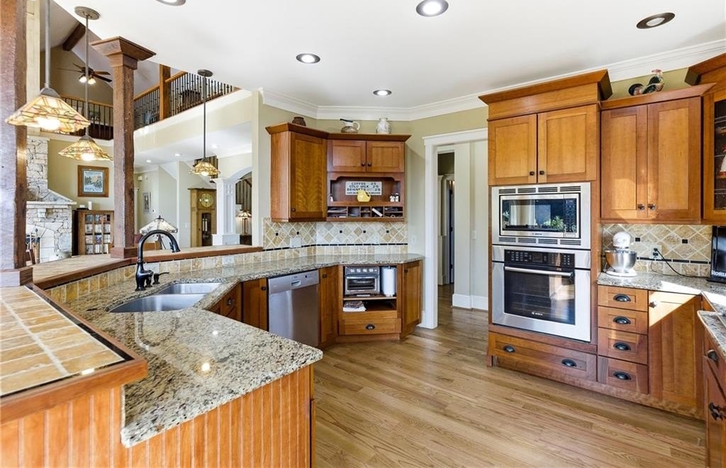 This stunning mountain retreat combines timeless craftsman design with sweeping western-facing views and resort-style amenities. Offering over 5,000 sq ft of living space, this expansive home includes 5 bedrooms, 4 full baths, 2 half baths, and a separate guest apartment above the garage—perfect for guests, multi-generational living, or a private home office. Located in Big Canoe’s sought-after lake and golf community, the home showcases breathtaking long-range and sunset views from nearly every room. The main level features a welcoming foyer, a vaulted great room with floor-to-ceiling windows, stone fireplace, and beamed ceilings, along with a gourmet kitchen featuring granite counters, stainless appliances, tile backsplash, bar seating, and a breakfast nook surrounded by panoramic mountain scenery. A formal dining room with coffered ceilings and custom millwork offers an elegant space for entertaining.The primary suite on the main level includes a double-sided fireplace from the great room, private deck access, jetted tub, walk-in shower, dual vanities, and a large walk-in closet. Upstairs you’ll find an additional bedroom with ensuite bath and private sitting area, while the terrace level offers three bedrooms and two full bathrooms, with beautiful hardwood floors. The sub-terrace level is spacious with wet bar, living room featuring gas fireplace, and a half bath. Multiple outdoor living spaces—including a screened porch, open deck, and lower terrace—invite you to relax and take in the mountain vistas. Community amenities include hiking trails, tennis, pickleball, championship golf courses, and lake access with beach area, fishing, and boating. Experience the best of luxury mountain living in Big Canoe—where thoughtful craftsmanship, layered mountain views, and resort-style amenities come together beautifully at 1043 Deer Run Ridge.