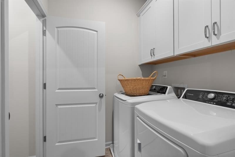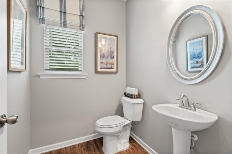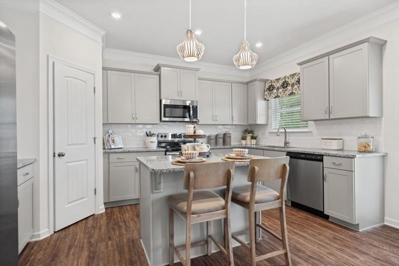 Move-In Ready December! The McGinnis plan by Smith Douglas Homes in Victoria Heights a new construction community in Dallas, GA. . This plan is one of our most sought-after designs— featuring an unfinished basement for future expansion or storage flexibility. This bright, open-concept home seamlessly connects the fireside family room with a sleek linear fireplace, breakfast nook, and island kitchen, creating an inviting space perfect for both everyday living and entertaining. The kitchen showcases granite countertops, upgraded white cabinetry with 42" upper cabinets, pendant lighting over the island, and stainless steel gas appliances.