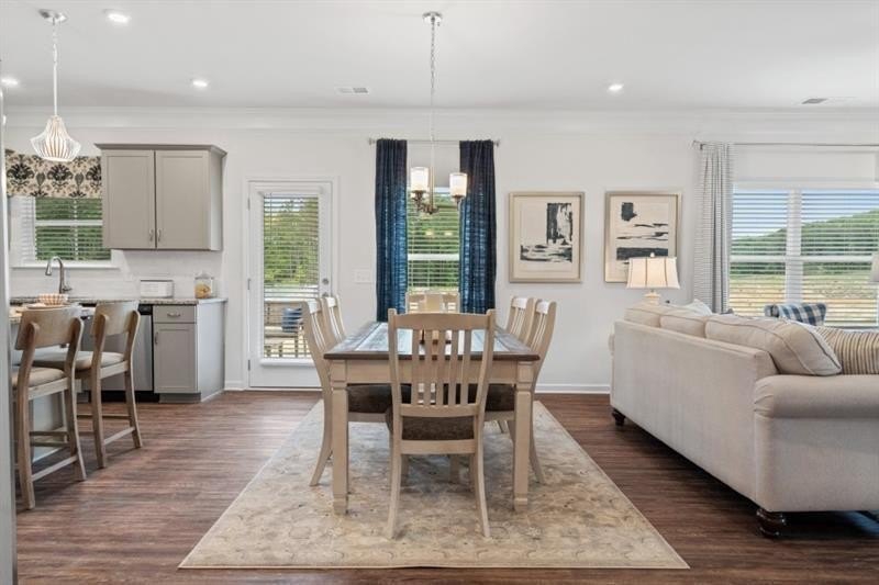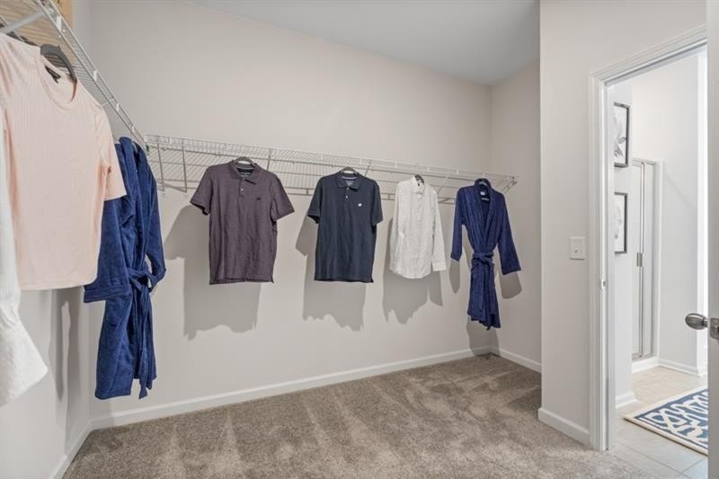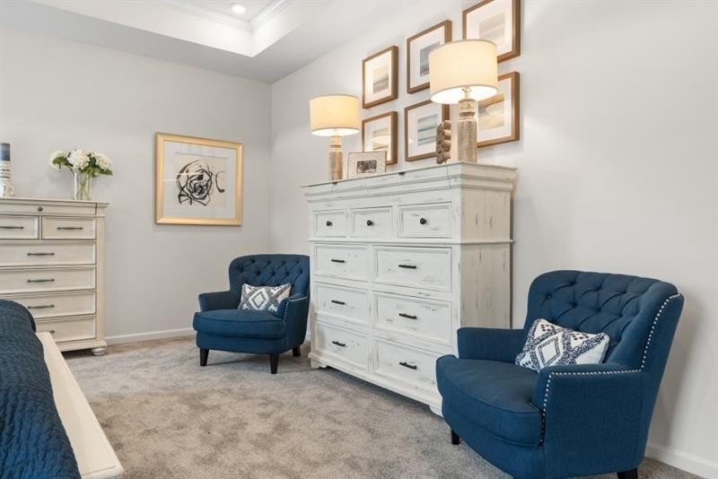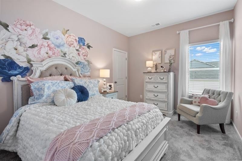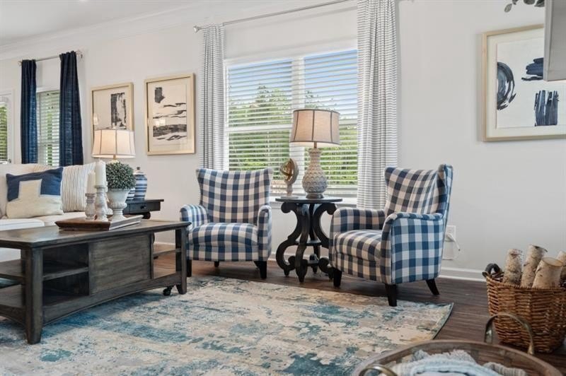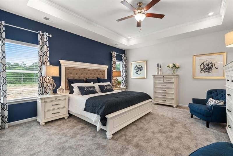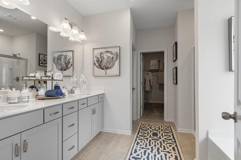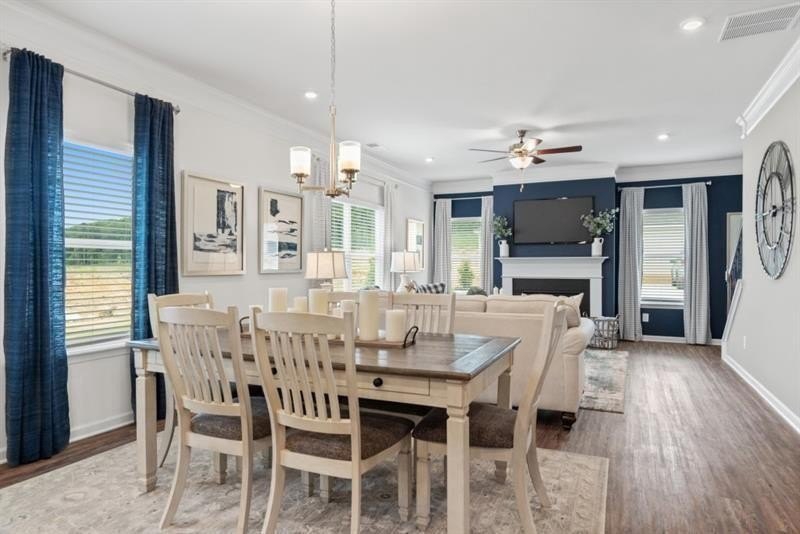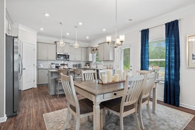 The spacious entry opens to a dining room, ideal for more formal gatherings. Upstairs, unwind in the spacious primary suite with a tray ceiling and a relaxing ensuite bath featuring a tiled shower, garden tub, and dual vanities. Three additional bedrooms, a shared bath with double sinks, a laundry room, and a loft complete the second floor. Both levels feature Smith Douglas Homes’ signature 9-foot ceilings, enhancing the home’s airy feel.