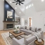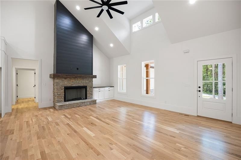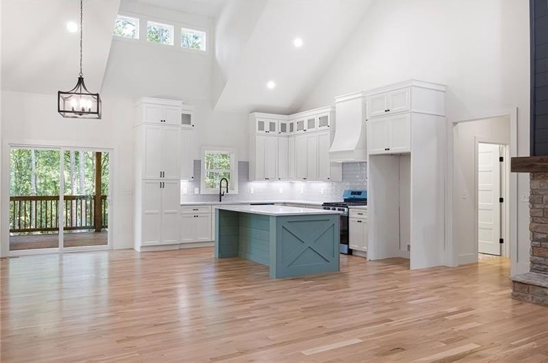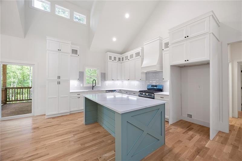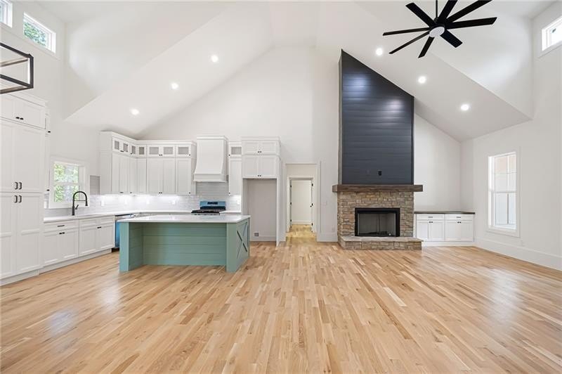 From the curb, cedar accents and a stone-front porch warmly welcome you, hinting at the quality and style found within. Step inside to find soaring ceilings and gorgeous white oak flooring that flows throughout—completely carpet-free. The heart of the home, the kitchen, is a true showstopper with double-stacked white cabinetry, including glass-front displays, soft-close doors, and a stylish vent hood that draws the eye to the high ceiling. The oversized island includes stainless steel appliances including an under-counter microwave, while quartz countertops and a gas range make everyday cooking feel gourmet. A spacious pantry with roll-out shelving adds practical beauty.