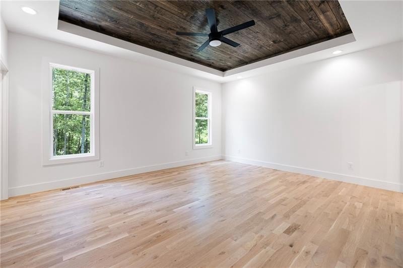 The open-concept living area is anchored by a gas fireplace with dramatic shiplap detailing that climbs the vaulted ceiling, flanked by custom built-ins for added charm and storage. The split-bedroom layout offers privacy, with the primary suite serving as a luxurious retreat. Enjoy wood-clad ceilings, two generously sized closets, and panoramic backyard views that include a peaceful pond. The en suite bath and secondary spaces continue the high-end theme with stylish finishes and thoughtful touches throughout.