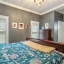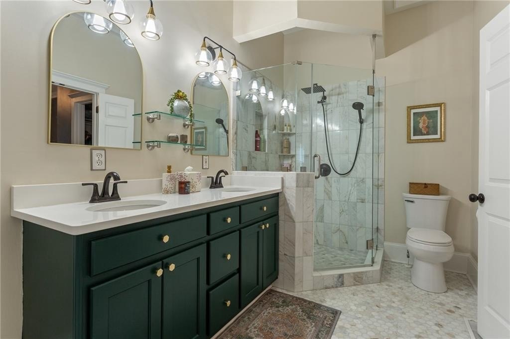 The main-level primary suite is a serene retreat, featuring a beautifully renovated spa-style bath with elegant tilework, modern lighting, and a dual-sink vanity.
