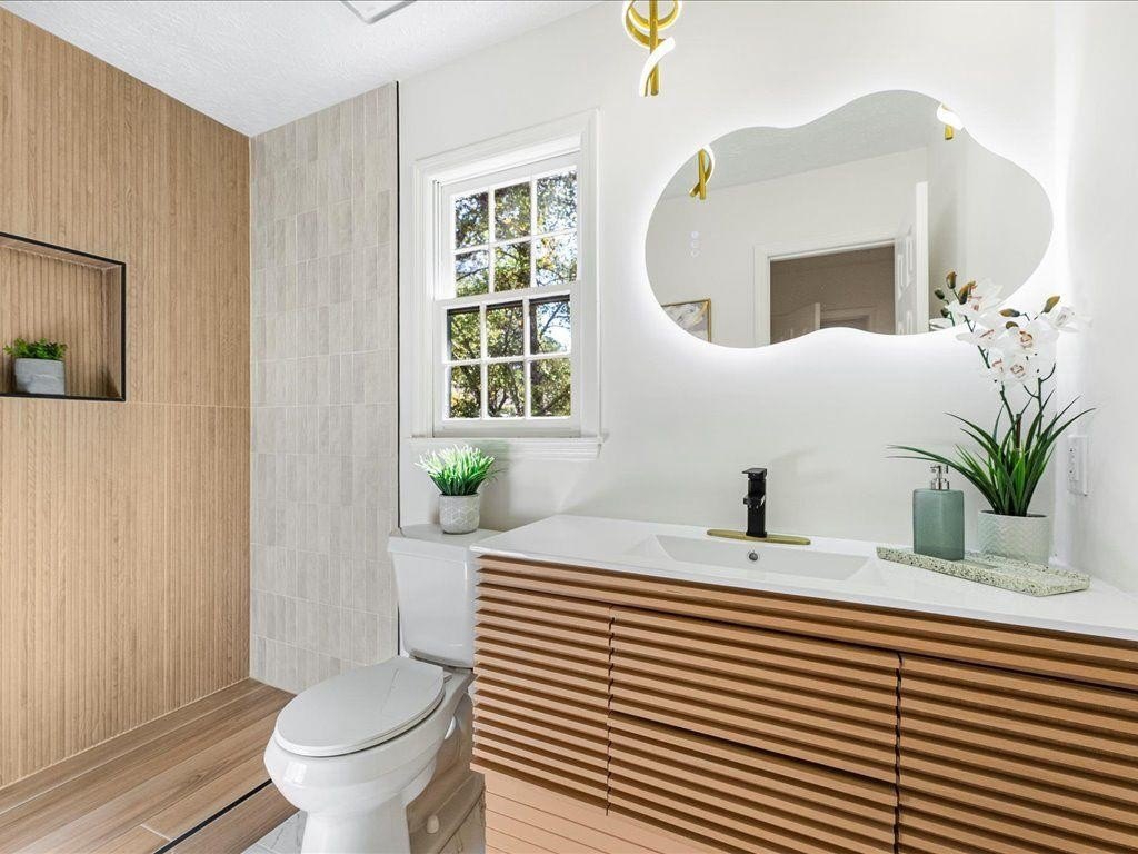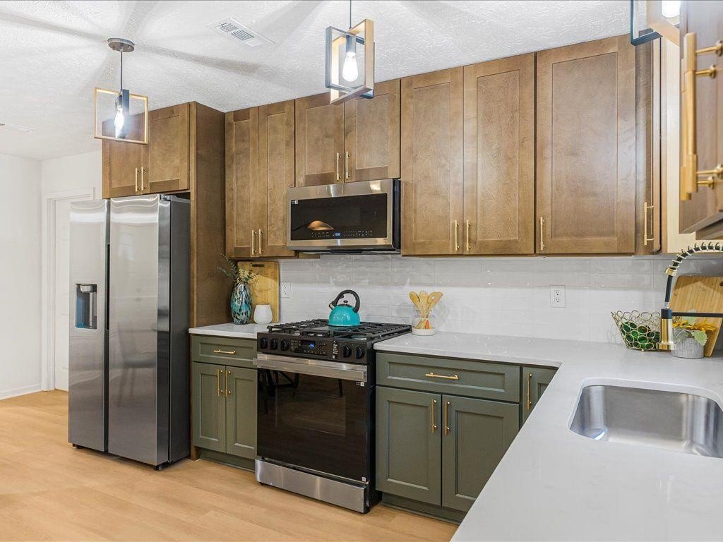 Welcome to this beautifully remodeled home featuring three bedrooms and two bathrooms. Step inside to an open-concept layout with a kitchen showcasing quartz countertops, stained cabinets, new stainless steel appliances, and elegant brass fixtures throughout. The living area includes a charming stone fireplace, perfect for cozy evenings. Both bathrooms are tastefully designed with modern tile finishes. The roof is only two years old, and the property includes a garage for added convenience. Enjoy the privacy of a serene backyard, ideal for relaxing or entertaining. Conveniently located just 15 minutes from Hartsfield-Jackson Airport and a 30-minute drive to downtown Atlanta.