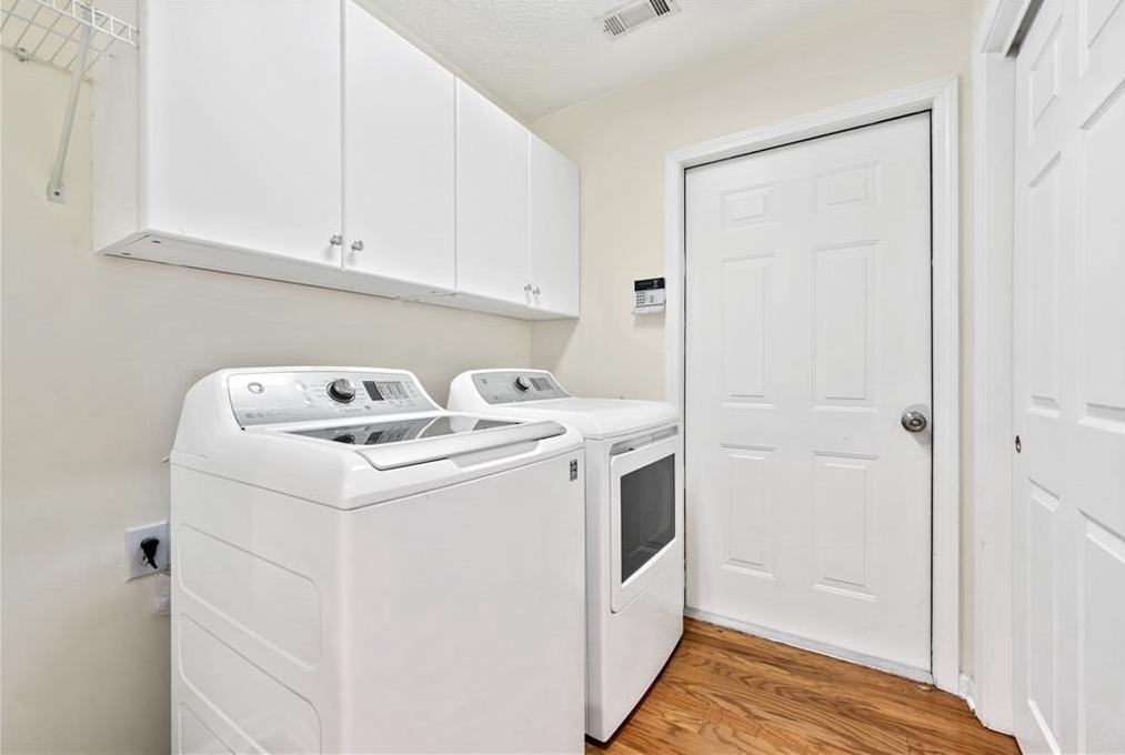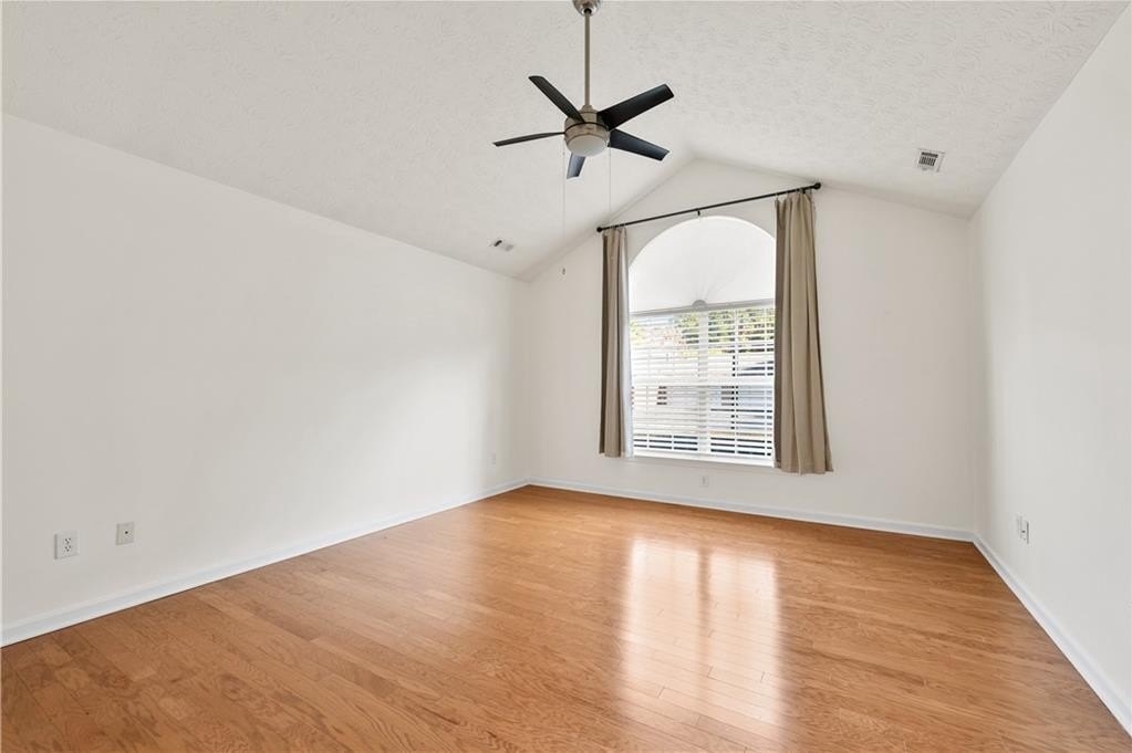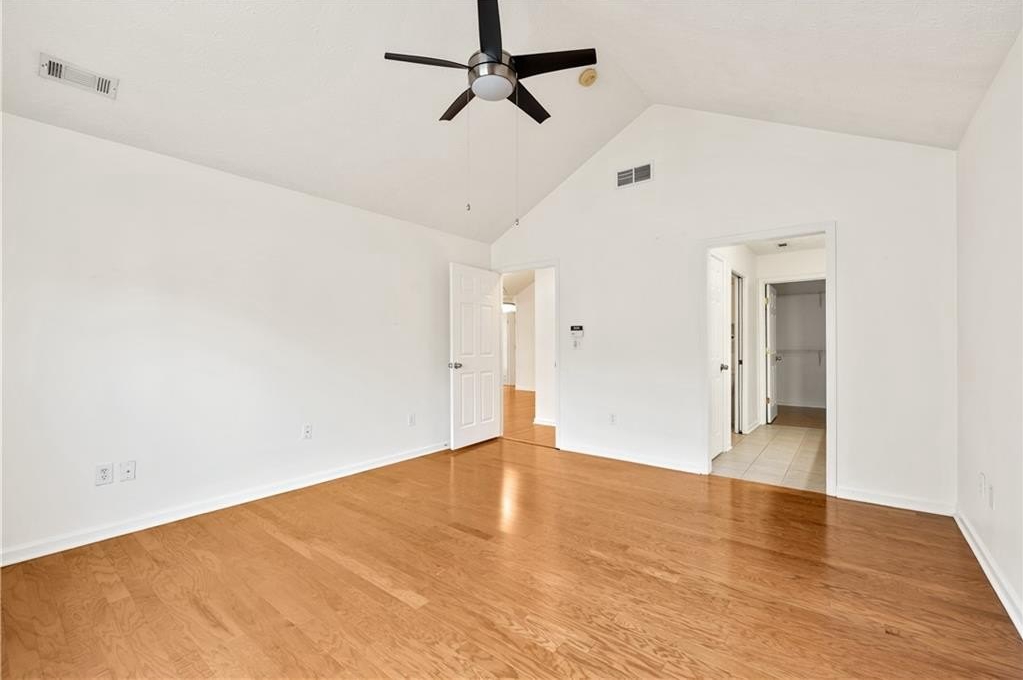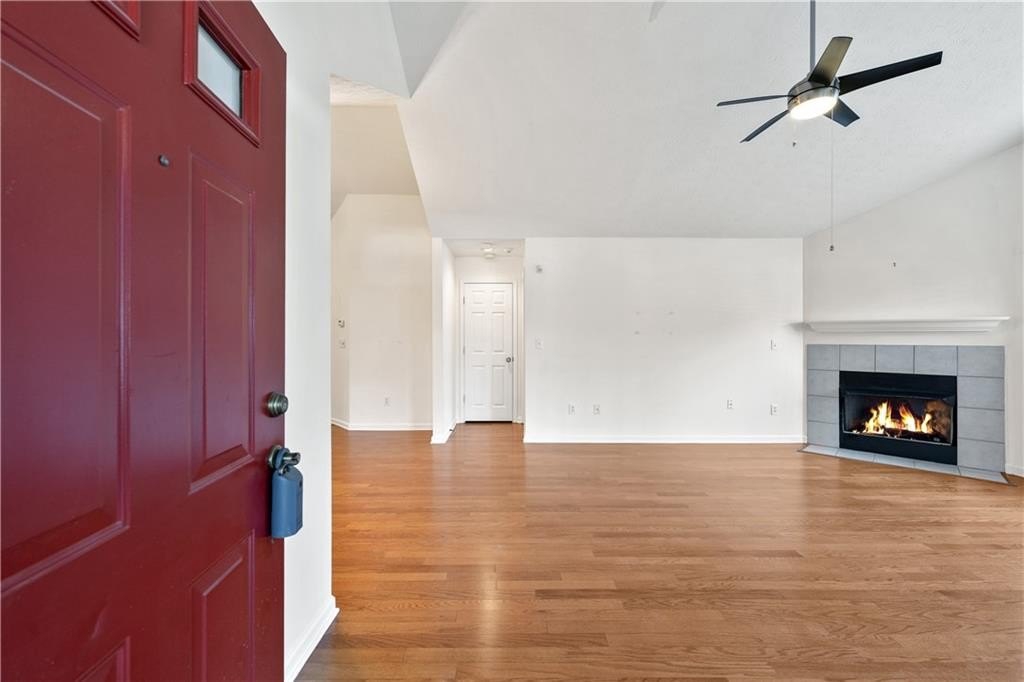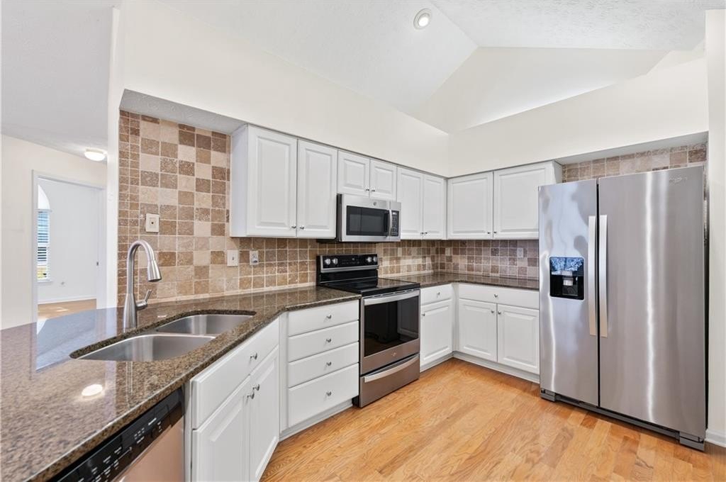 There is hardwood flooring throughout this open concept, 3 bedroom/2 bath one level home. The main living area features abundant natural light and high vaulted ceilings, gas fireplace and large sunroom. The kitchen offers granite counters, white cabinets and stainless steel appliances. The refrigerator, washer and dryer are included! The master bedroom is large with over sized master closet and en-suite bathroom featuring updated shower and large double sink vanity. Two additional bedrooms are perfect for guests or an office and additional space. The large, two car garage is kitchen level and offers easy access to the front of the community.