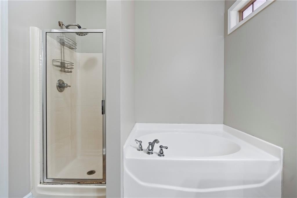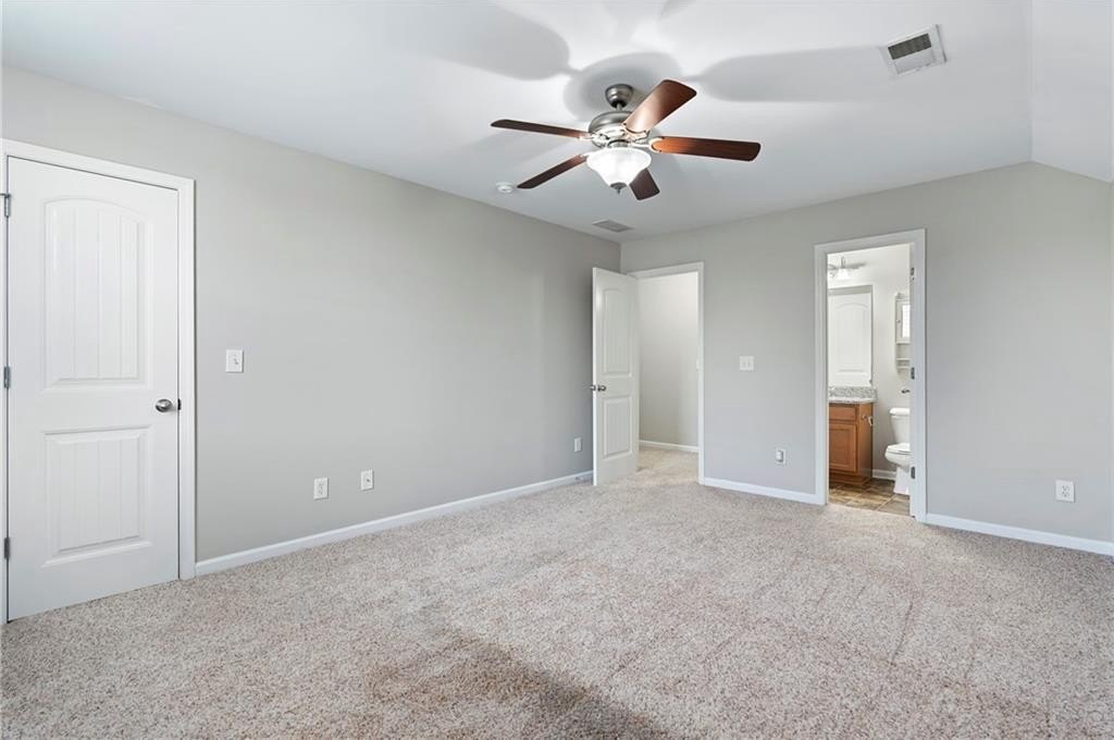 The large primary suite on the main level includes a private bath with a double-sink vanity and soaking tub, while walk-in and large closets are found in every bedroom. Both the main and second levels offer generous storage options, including a spacious upstairs bedroom with its own full bathroom.