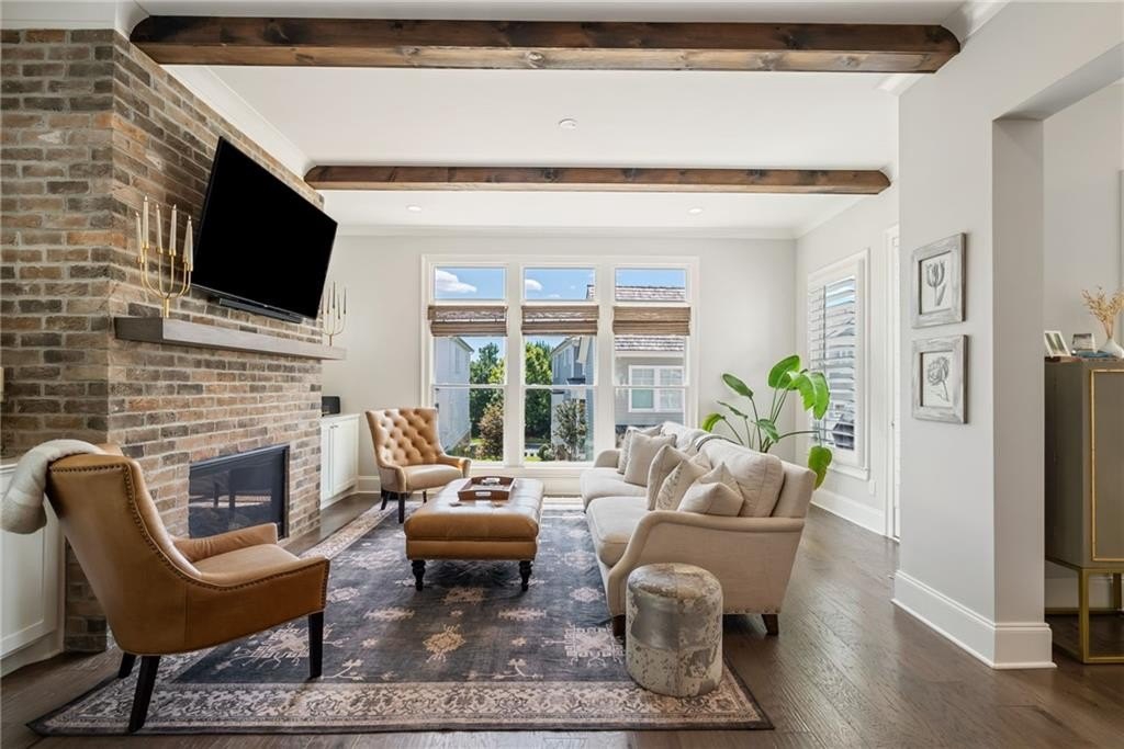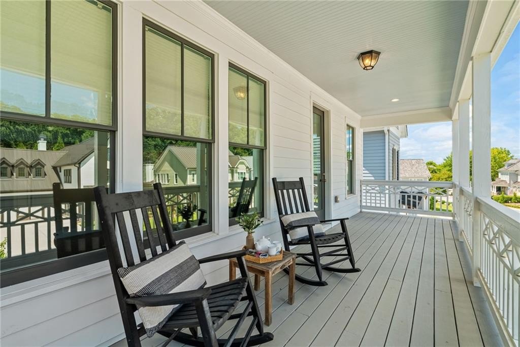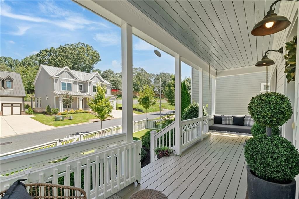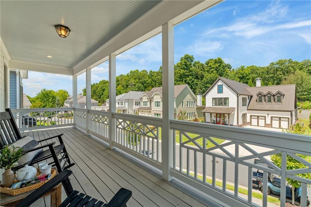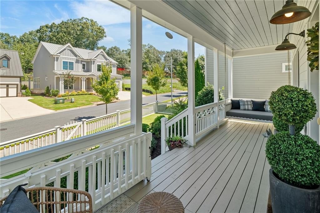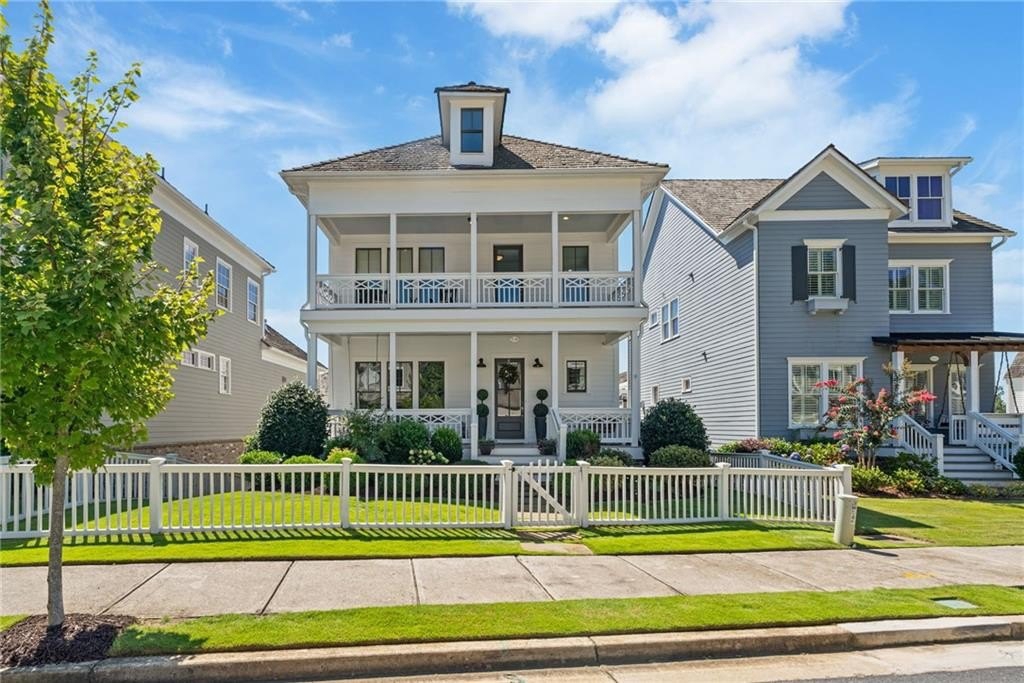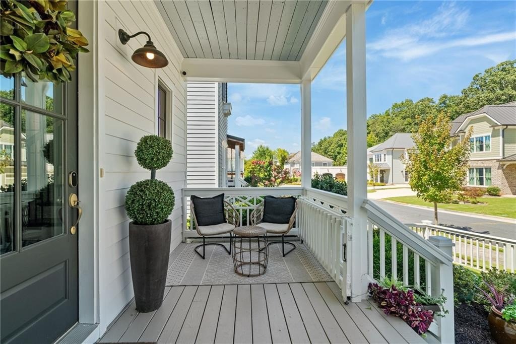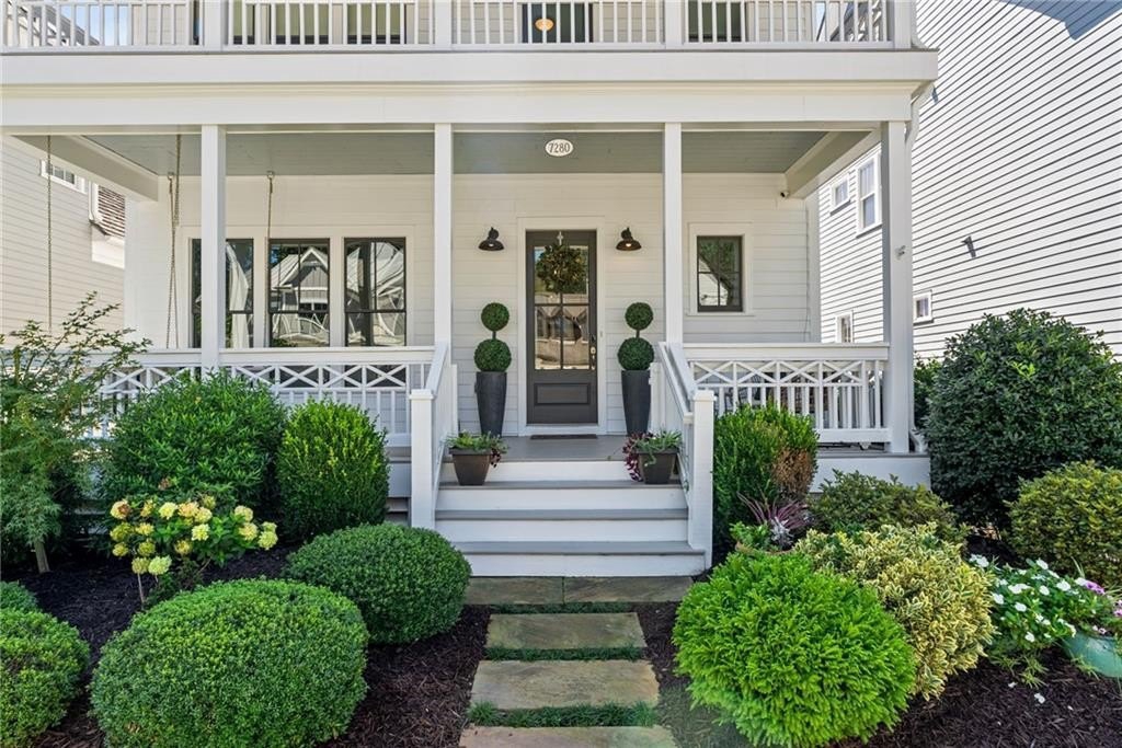 Wow-what an amazing opportunity to be in the sought after live-work-play Vickery community! Beautiful Vickery home featuring 3 outdoor living spaces! 2 covered porches spanning across the front of the home plus a deck on the back of the home! Popular floor plan offers the perfect mix of functionality with designer aesthetics! Guest suite on the main level with a full bath-makes for a great flex room! Very bright and open concept plan with the main floor featuring beamed ceilings, a chef’s modern kitchen, warm and comfortable family room w/ fireplace, a wall of windows and a breakfast/sitting room, plus a formal dining room*Terrace level offers a flex room that makes for great space for a media room/office/exercise room/guest overflow space/etc and features an en suite bathroom! A mud drop area offers a nice place for book bags and shoes when entering the home! Upstairs features a primary suite upgraded with hardwood floors and ceiling beams! His and hers closets in the modern primary bath with an oversized shower and separate vanities!