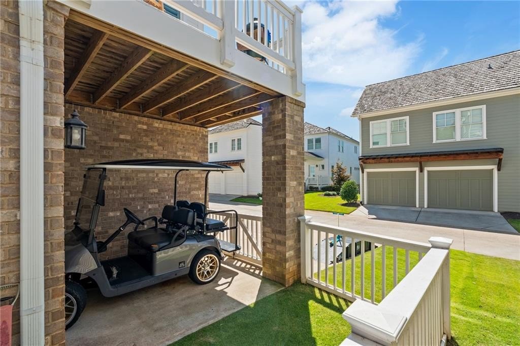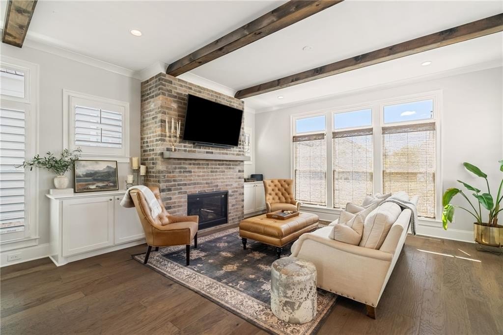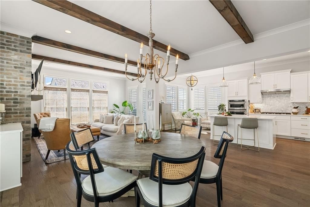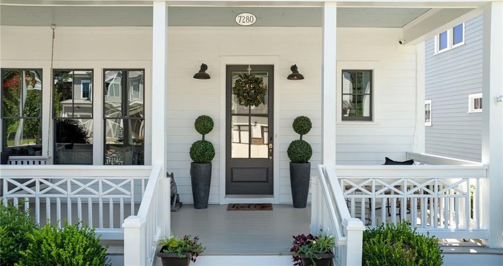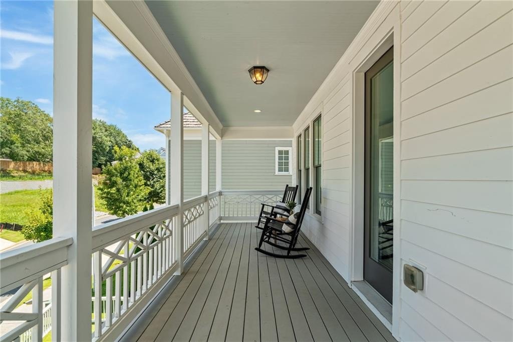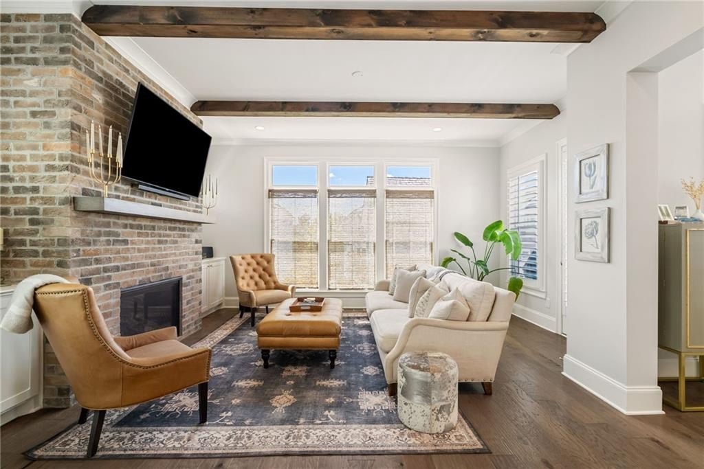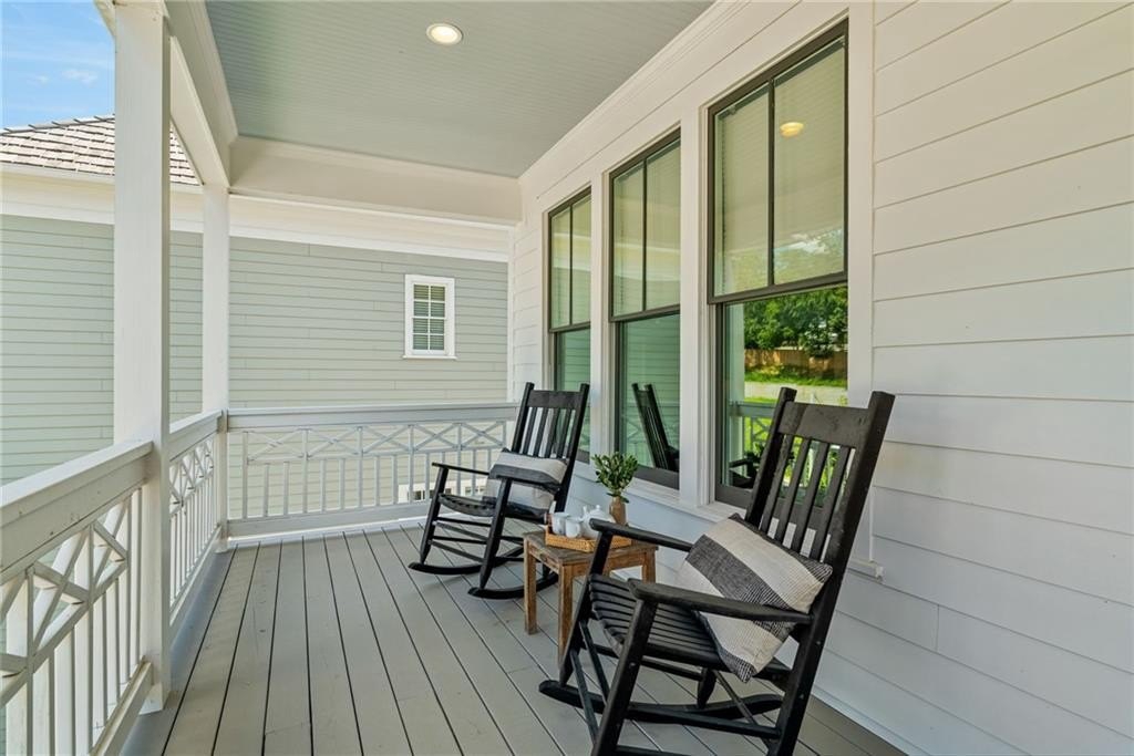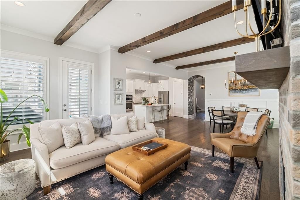 Wow-what an amazing opportunity to be in the sought after live-work-play Vickery community! Beautiful Vickery home featuring 3 outdoor living spaces! 2 covered porches spanning across the front of the home plus a deck on the back of the home! Popular floor plan offers the perfect mix of functionality with designer aesthetics! Guest suite on the main level with a full bath-makes for a great flex room! Very bright and open concept plan with the main floor featuring beamed ceilings, a chef’s modern kitchen, warm and comfortable family room w/ fireplace, a wall of windows and a breakfast/sitting room, plus a formal dining room*Terrace level offers a flex room that makes for great space for a media room/office/exercise room/guest overflow space/etc and features an en suite bathroom! A mud drop area offers a nice place for book bags and shoes when entering the home! Upstairs features a primary suite upgraded with hardwood floors and ceiling beams! His and hers closets in the modern primary bath with an oversized shower and separate vanities!