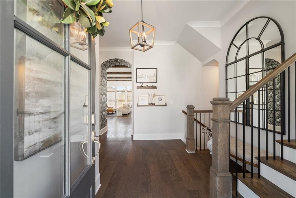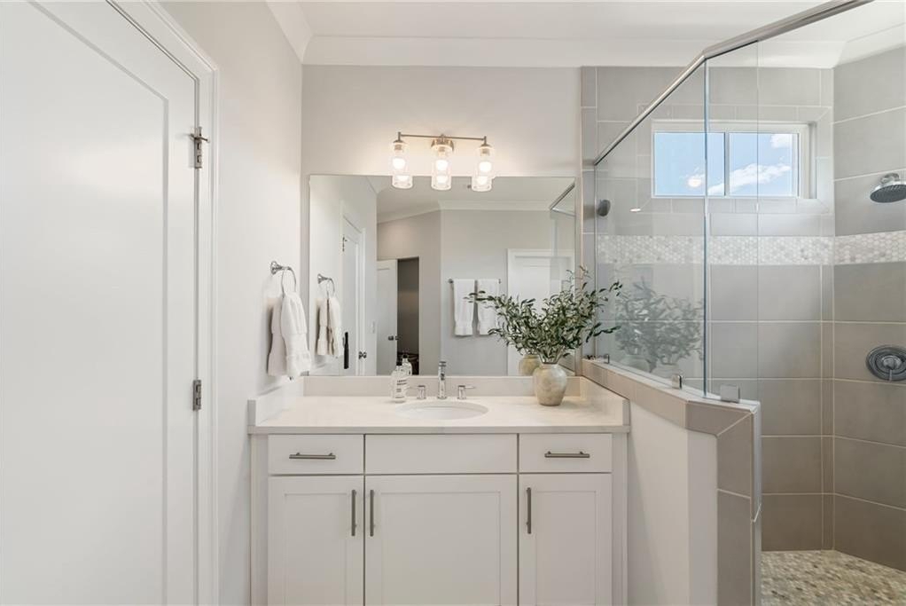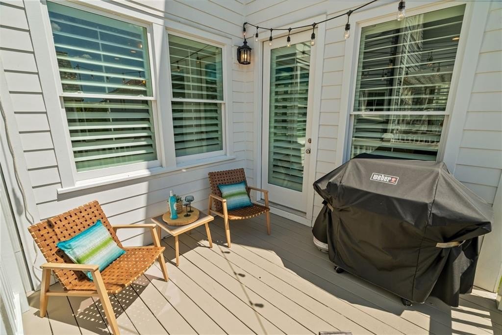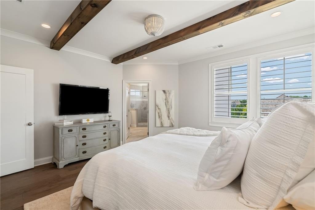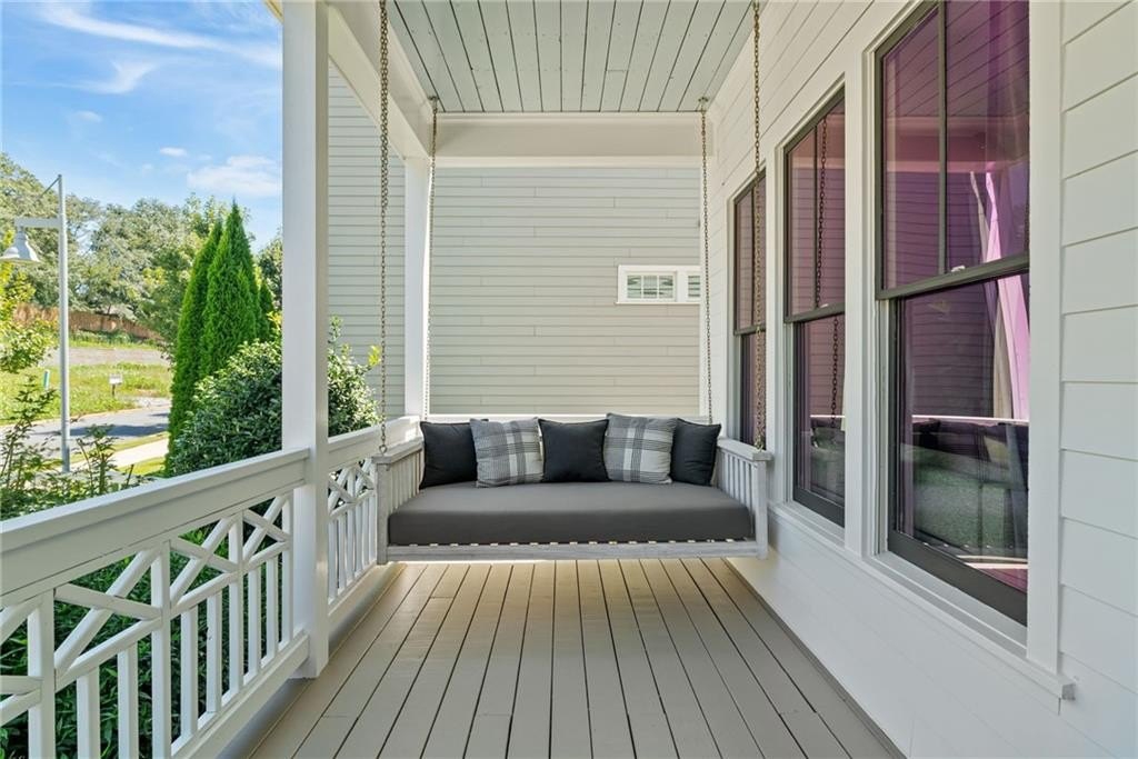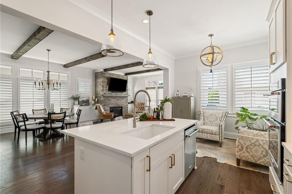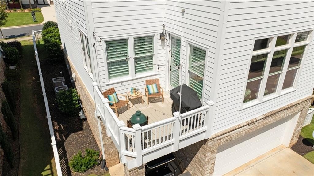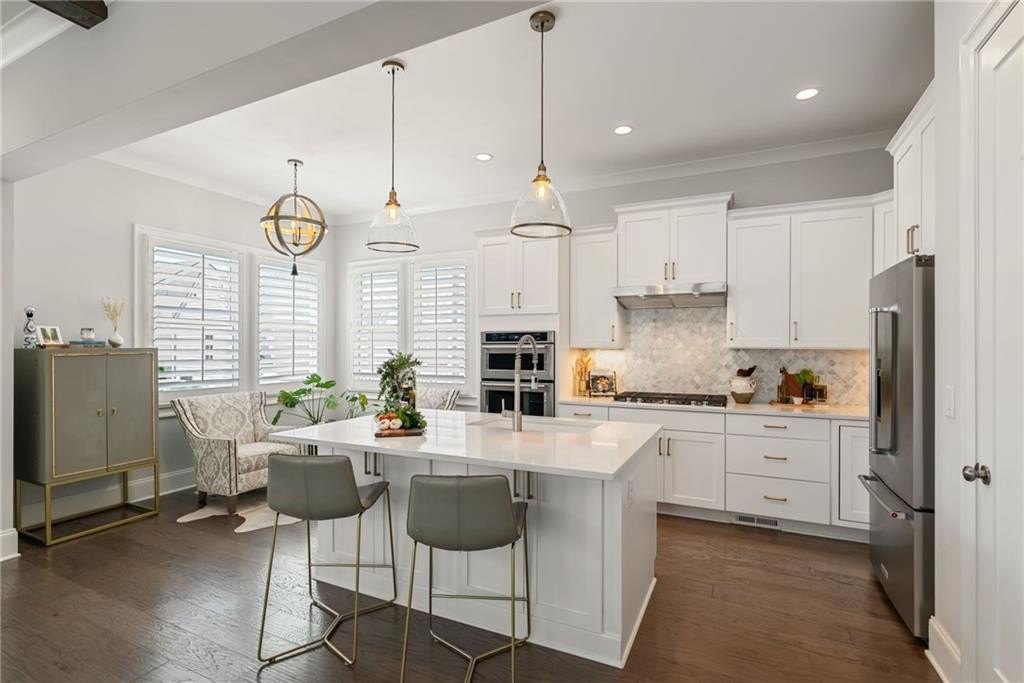 Wow-what an amazing opportunity to be in the sought after live-work-play Vickery community! Beautiful Vickery home featuring 3 outdoor living spaces! 2 covered porches spanning across the front of the home plus a deck on the back of the home! Popular floor plan offers the perfect mix of functionality with designer aesthetics! Guest suite on the main level with a full bath-makes for a great flex room! Very bright and open concept plan with the main floor featuring beamed ceilings, a chef’s modern kitchen, warm and comfortable family room w/ fireplace, a wall of windows and a breakfast/sitting room, plus a formal dining room*Terrace level offers a flex room that makes for great space for a media room/office/exercise room/guest overflow space/etc and features an en suite bathroom! A mud drop area offers a nice place for book bags and shoes when entering the home! Upstairs features a primary suite upgraded with hardwood floors and ceiling beams! His and hers closets in the modern primary bath with an oversized shower and separate vanities!