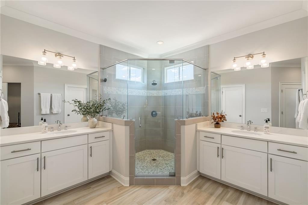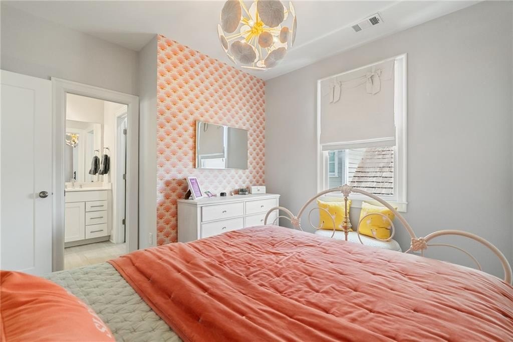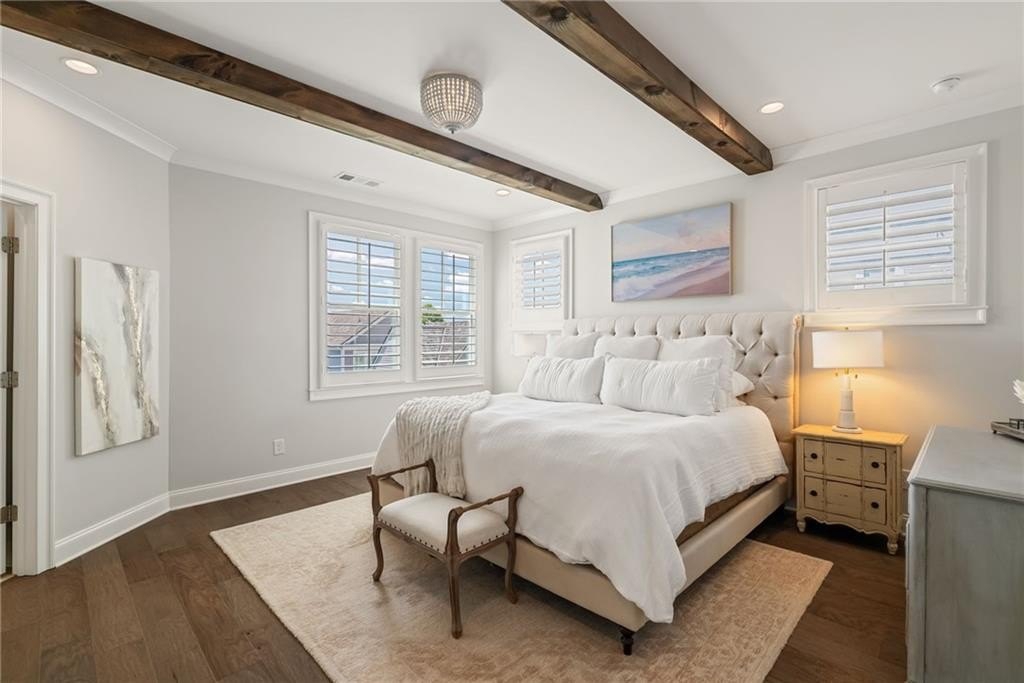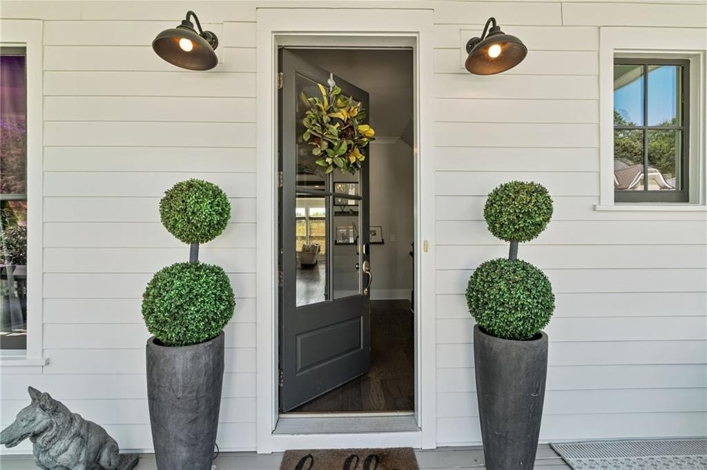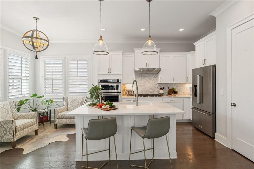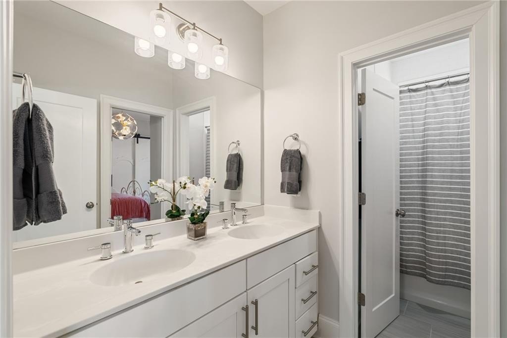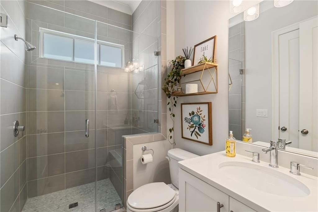 Wow-what an amazing opportunity to be in the sought after live-work-play Vickery community! Beautiful Vickery home featuring 3 outdoor living spaces! 2 covered porches spanning across the front of the home plus a deck on the back of the home! Popular floor plan offers the perfect mix of functionality with designer aesthetics! Guest suite on the main level with a full bath-makes for a great flex room! Very bright and open concept plan with the main floor featuring beamed ceilings, a chef’s modern kitchen, warm and comfortable family room w/ fireplace, a wall of windows and a breakfast/sitting room, plus a formal dining room*Terrace level offers a flex room that makes for great space for a media room/office/exercise room/guest overflow space/etc and features an en suite bathroom! A mud drop area offers a nice place for book bags and shoes when entering the home! Upstairs features a primary suite upgraded with hardwood floors and ceiling beams! His and hers closets in the modern primary bath with an oversized shower and separate vanities!