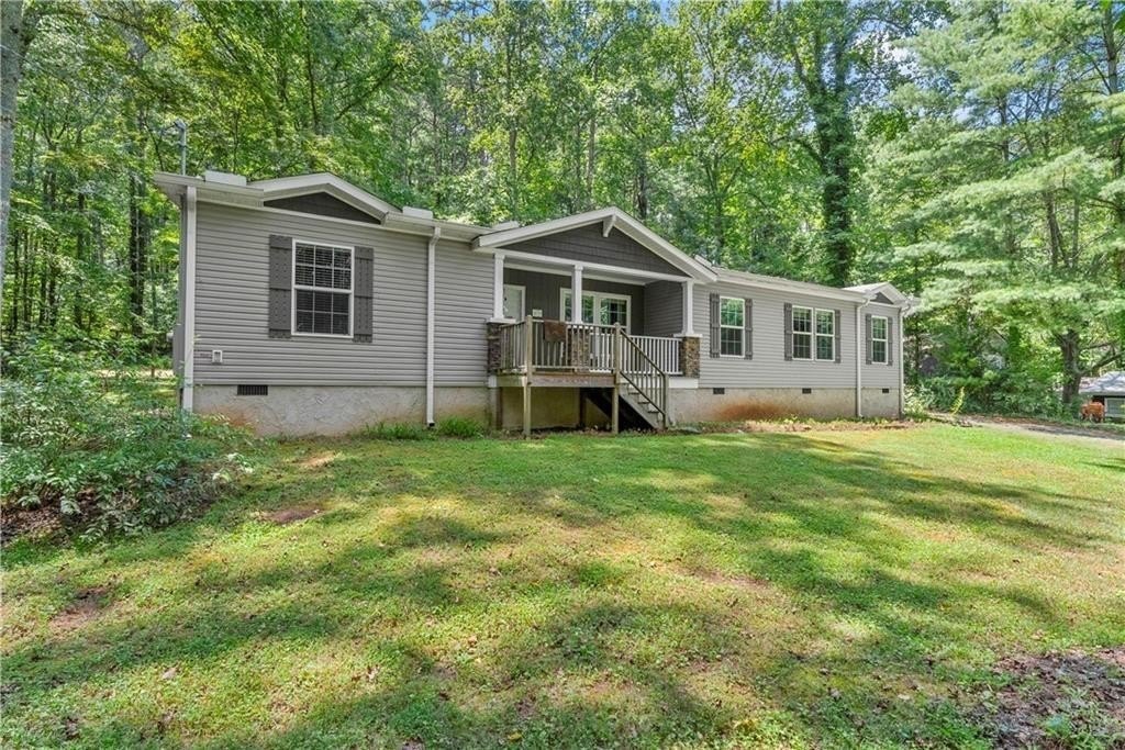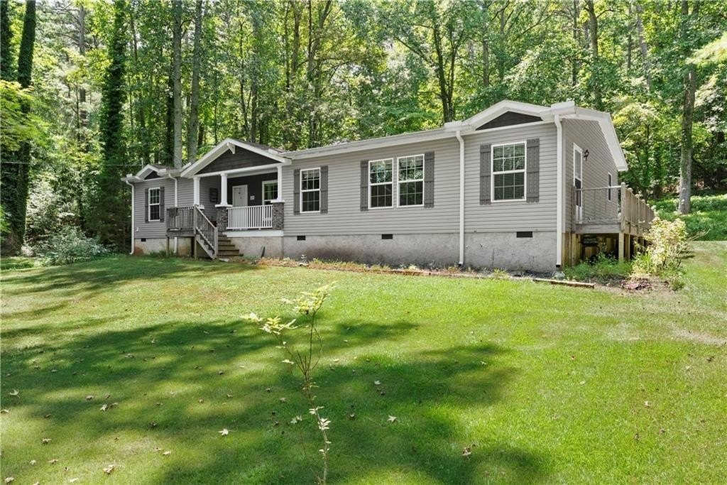 Welcome home to this meticulously well-maintained 3 bedroom, 2 bathroom manufactured home sitting on a permanent foundation! Situated on one level acre of land in the highly desired Sequoyah District, this home has NO HOA and plenty of wooded privacy! Bring your RV or outdoor toys! Over 1900+ SQ FT, inside, you will find an open concept, main living area featuring wooden beams and a stacked stone fireplace. Just off the family room is your spacious kitchen/dining area featuring a large island and stained kitchen cabinets. Your primary suite is over-sized and offers his/hers separate walk-in closets and vanities! Enjoy soaking in your garden tub while enjoying the nature views! On the other side of the home, you will find two secondary bedrooms with large walk-in closets as well as a secondary bathroom. Quick and easy access to East Cherokee Dr; Hwy 5; Hwy 575 - just minutes to all the shopping and dining of Canton, Woodstock or Hickory Flat! FHA and VA approved (Title has been retired)! Come tour this home today!