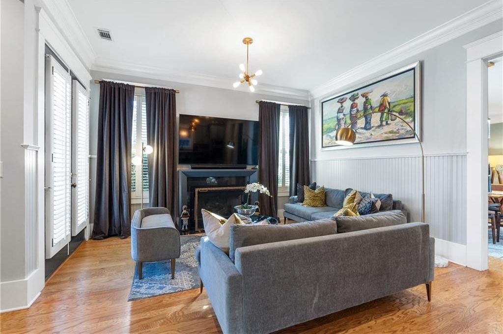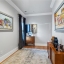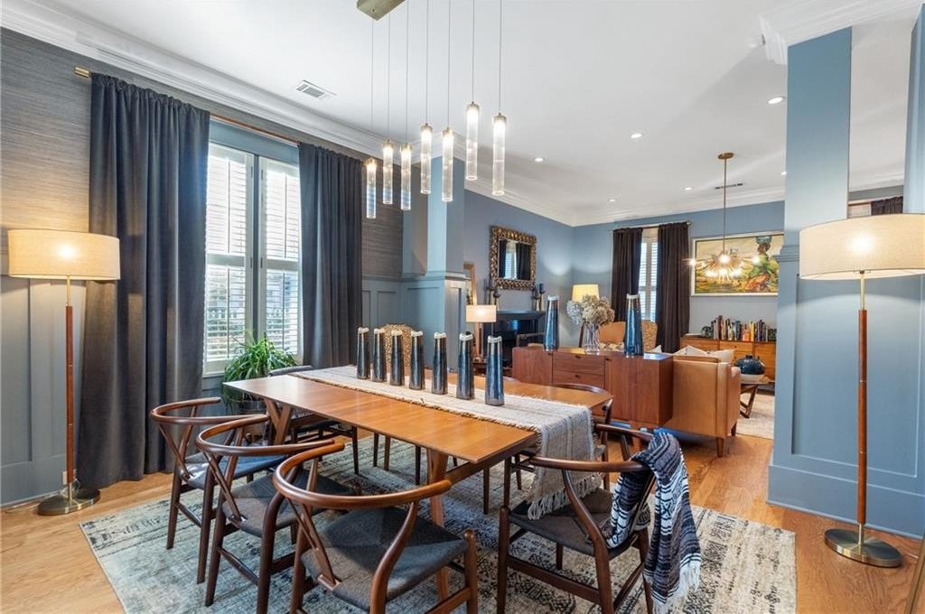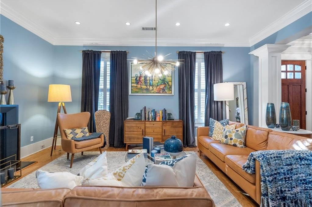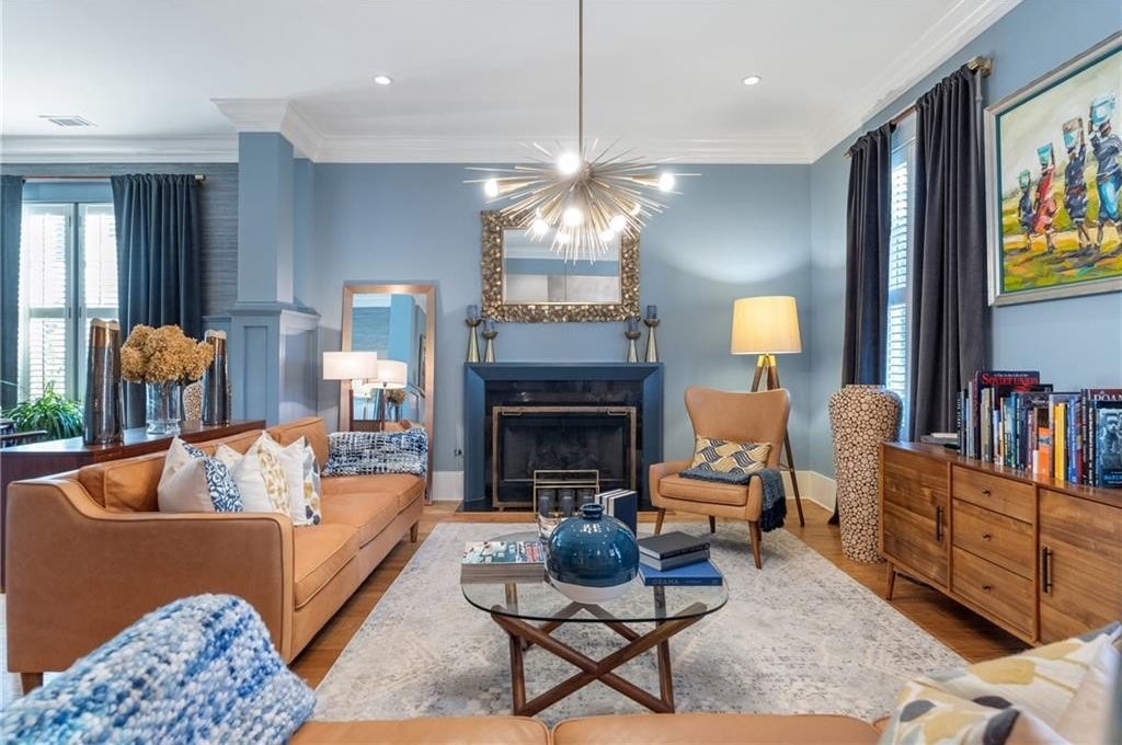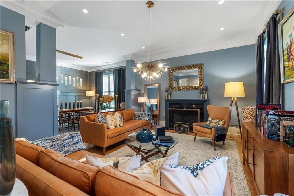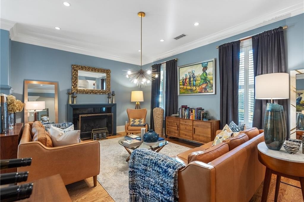 Inside, elegance unfolds with soaring ceilings, gleaming hardwood floors, and impeccable craftsmanship. Deep baseboards, heavy crown moulding, custom trim, accent paneling, rich saturated colors, and designer lighting create a layered, luxurious aesthetic that feels both sophisticated and welcoming.