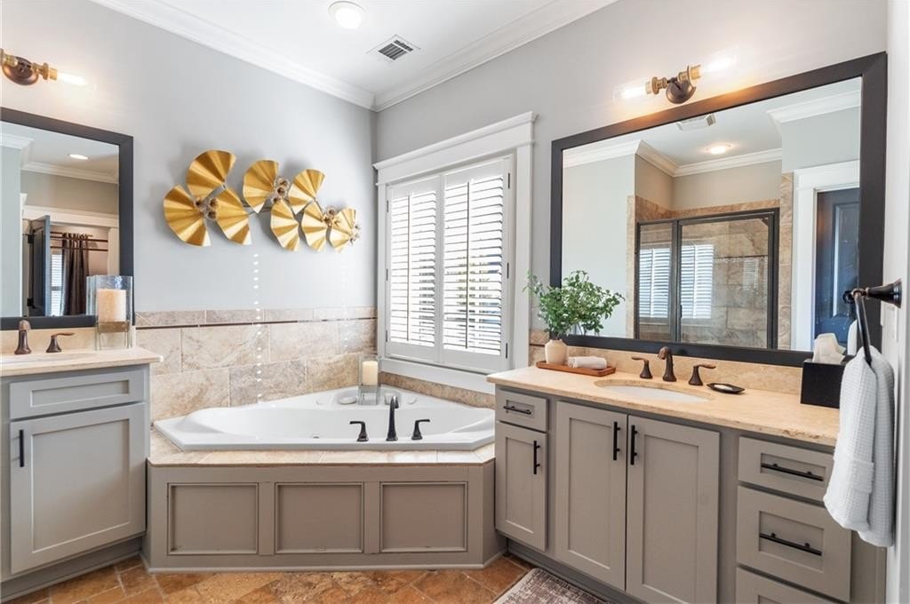 A rare second staircase leads to a private bonus room, ideal for a home office, media space, or dreamy library, while the main staircase opens to an airy landing that connects three spacious bedrooms and two full baths, each with split dual vanities. The primary suite is a retreat unto itself, offering two custom closets and a private balcony spanning the full width of the home.