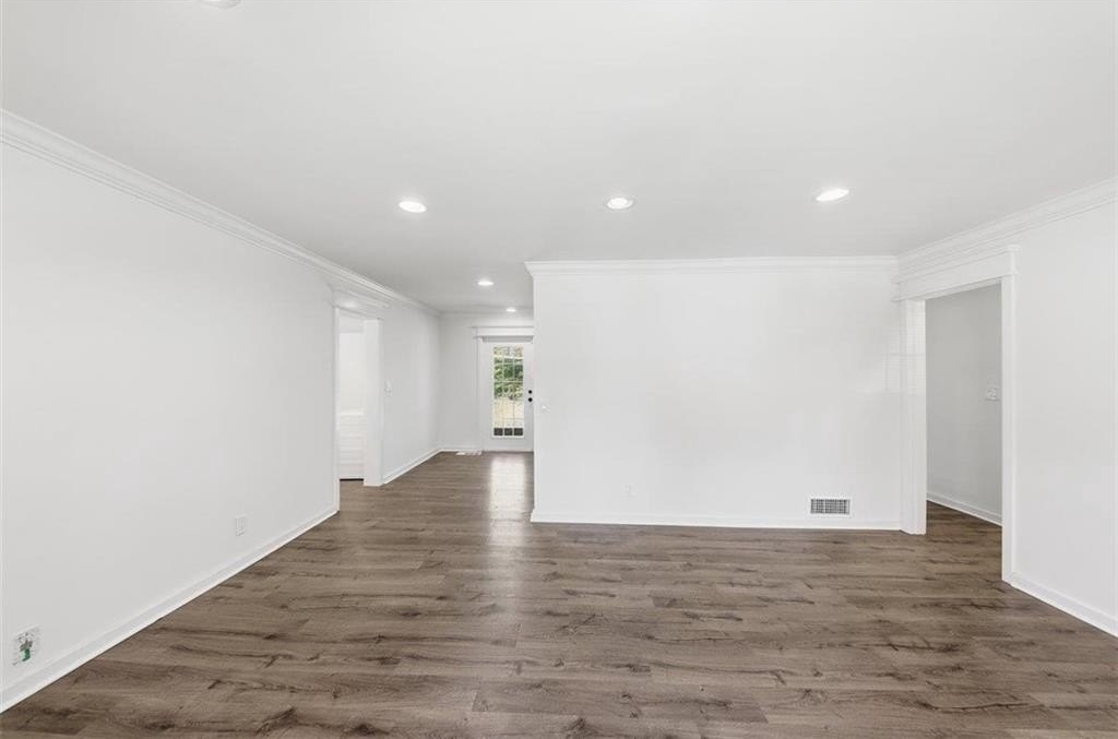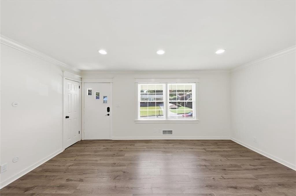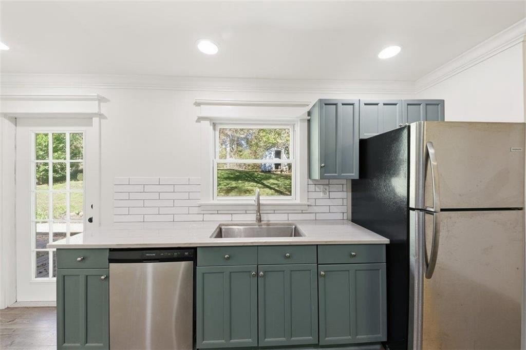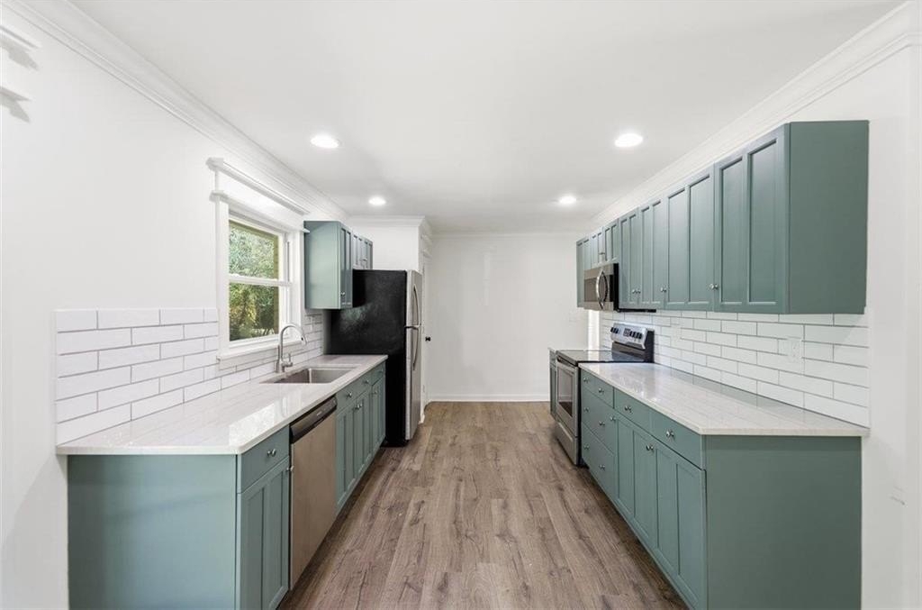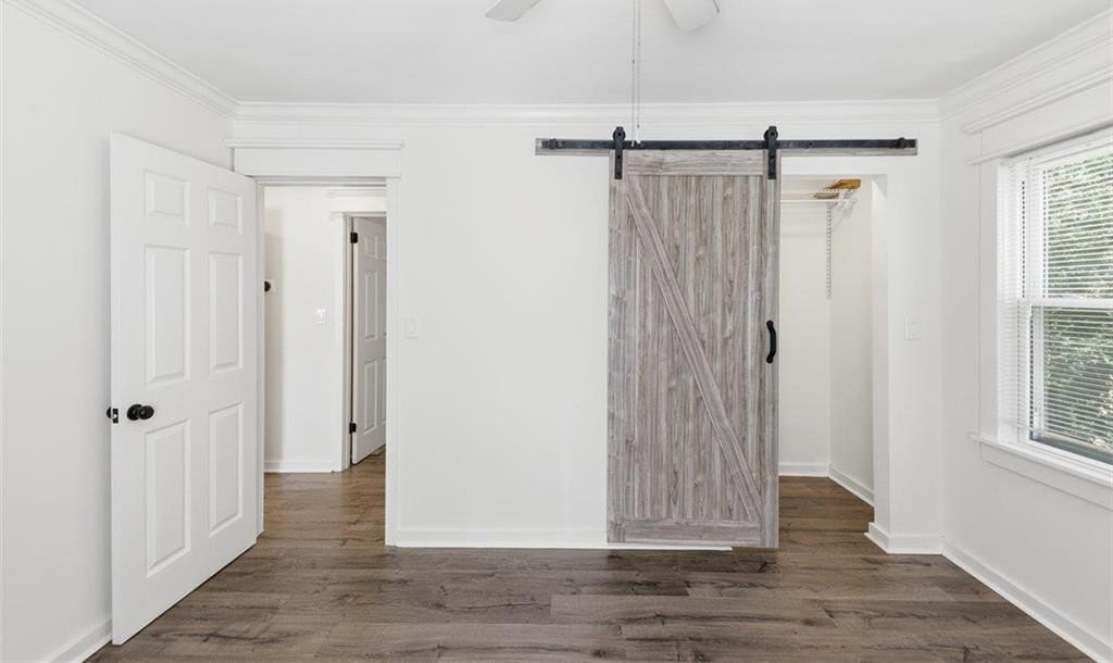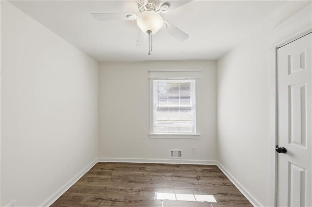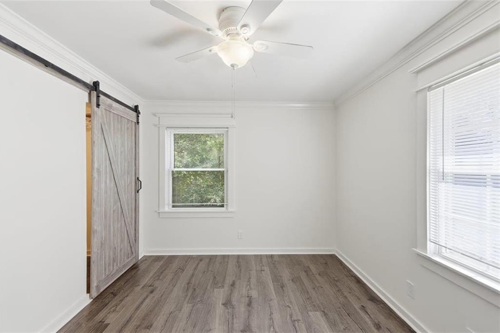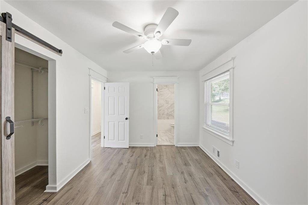 Charming brick ranch home, fully renovated and move-in ready! This beautiful property features gorgeous LVP flooring throughout the main living areas and stylish barn doors on the closets. The kitchen shines with a farmhouse sink, stunning countertops, and stainless-steel appliances. Enjoy three spacious bedrooms, two full bathrooms, and a versatile bonus flex area — perfect for an office or playroom. Excellent natural light fills every room. Step outside to a fenced backyard with a patio ideal for entertaining, plus a convenient storage unit. Prime location just minutes to Truist Park, The Battery, Village Green, Market Village, shopping, dining, and more! No HOA or rental restrictions — an excellent opportunity for investors or homeowners alike.