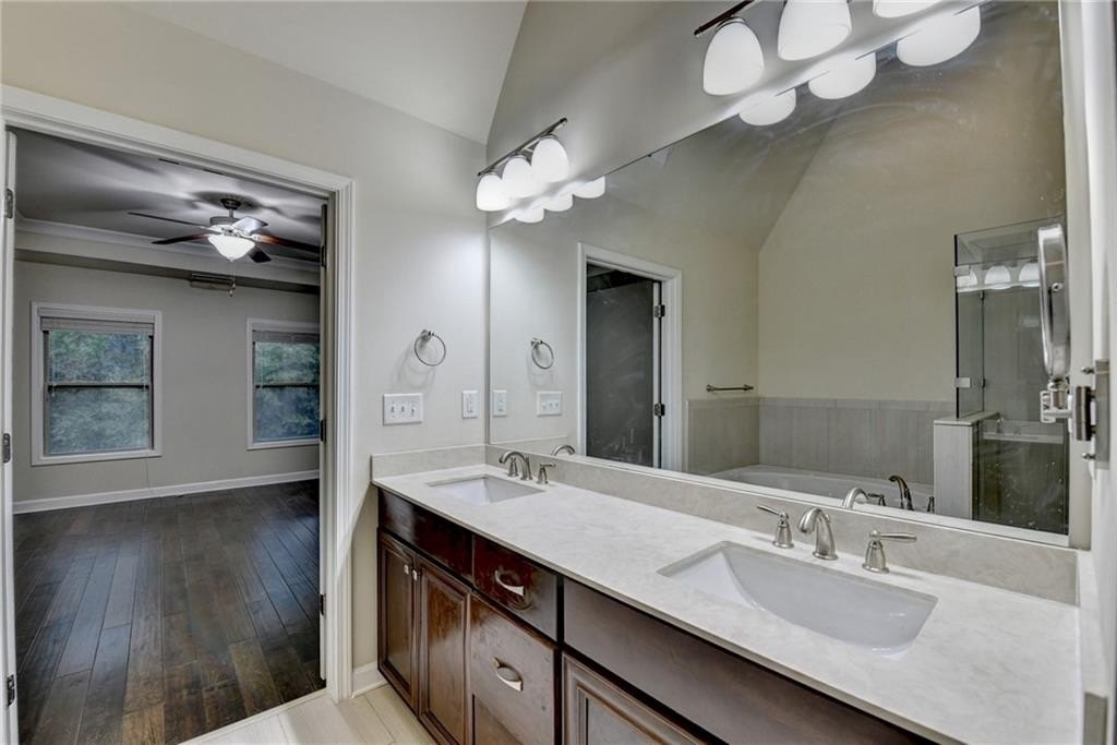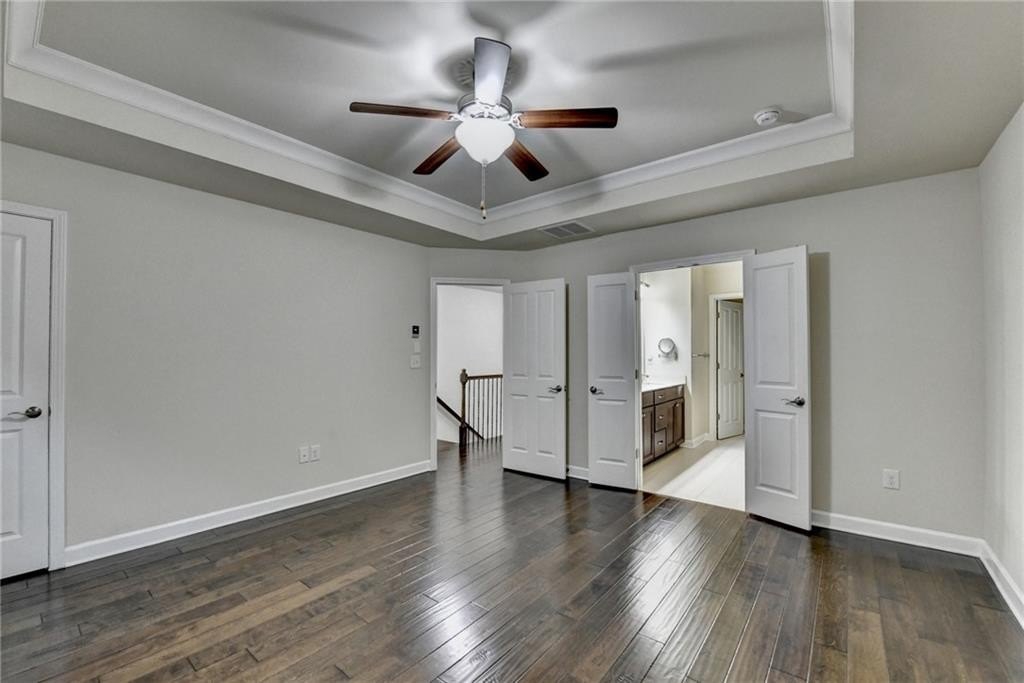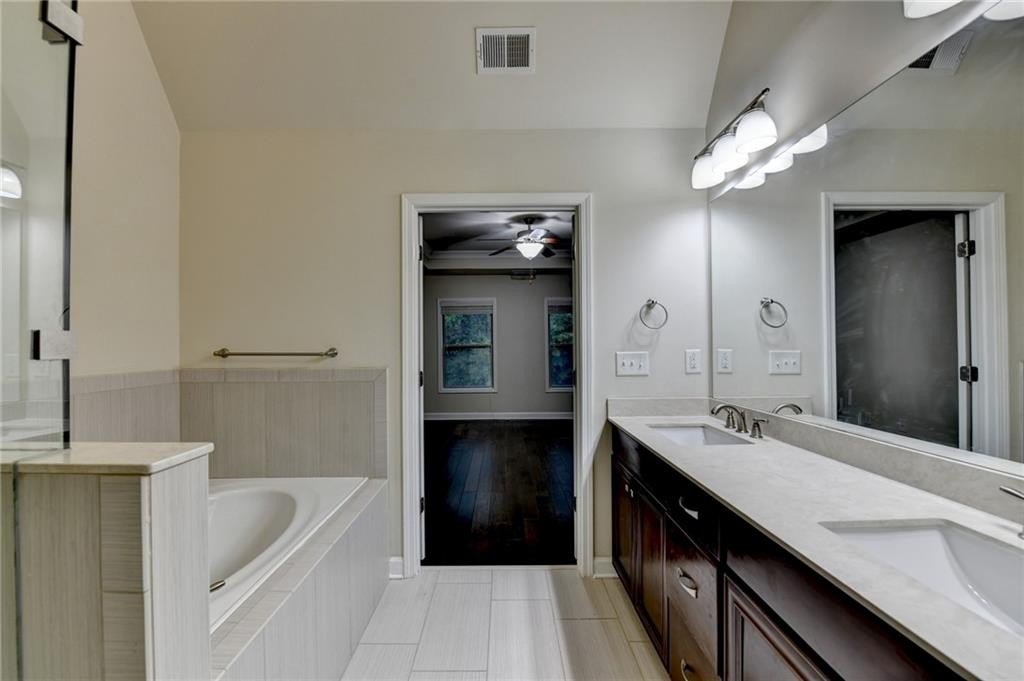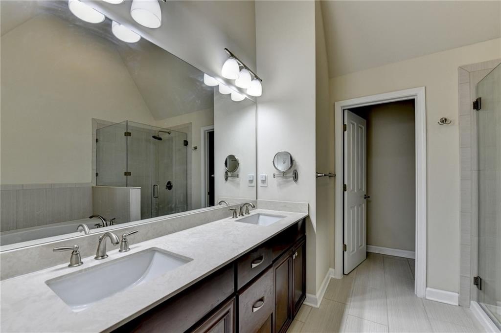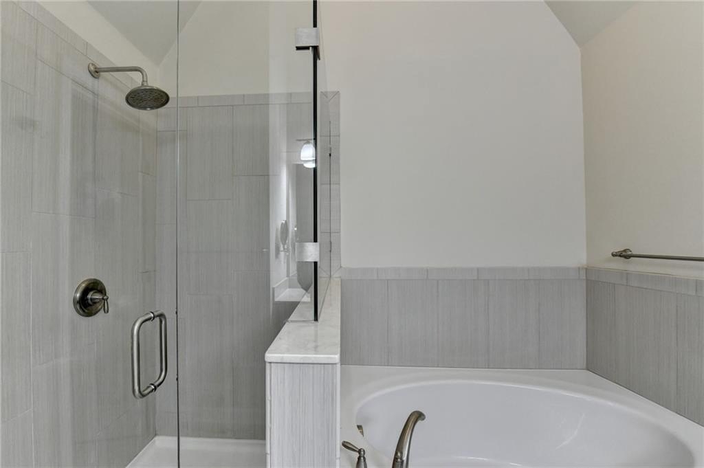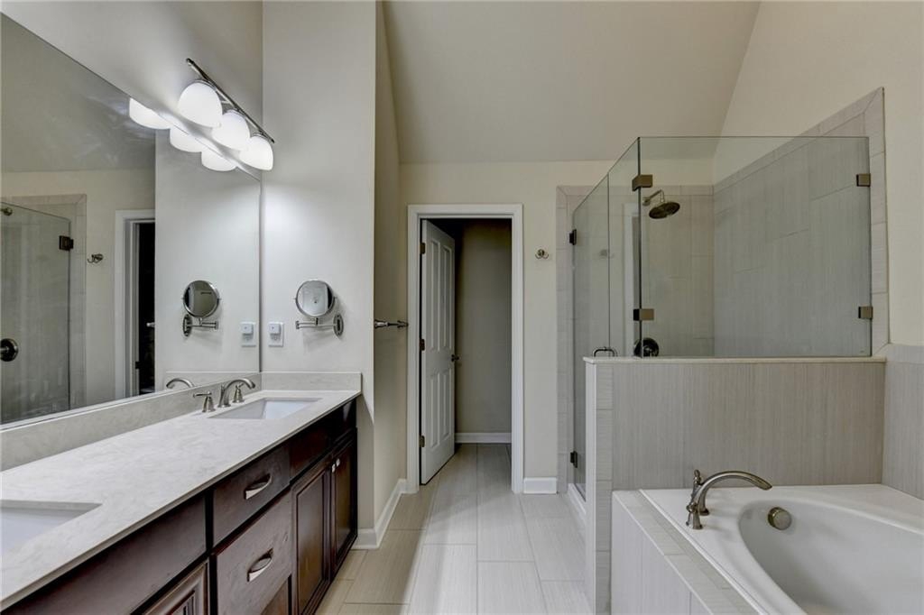 Upstairs, the luxurious owner's suite impresses with a trey ceiling, large walk-in closet, and spa-inspired bath featuring dual vanities, a frameless glass shower, soaking tub, and vaulted ceilings.