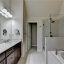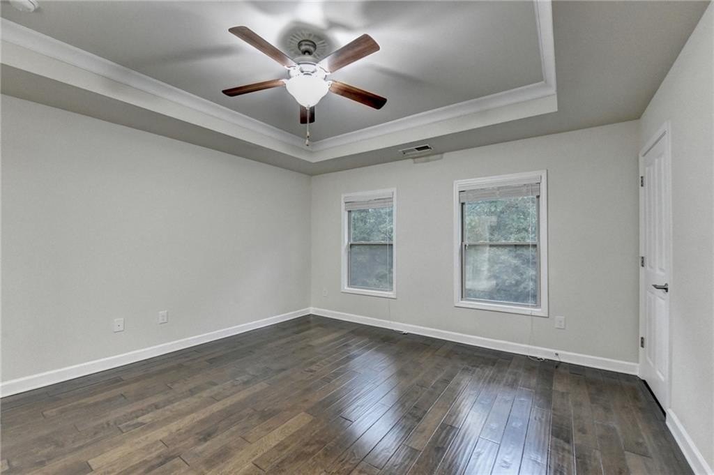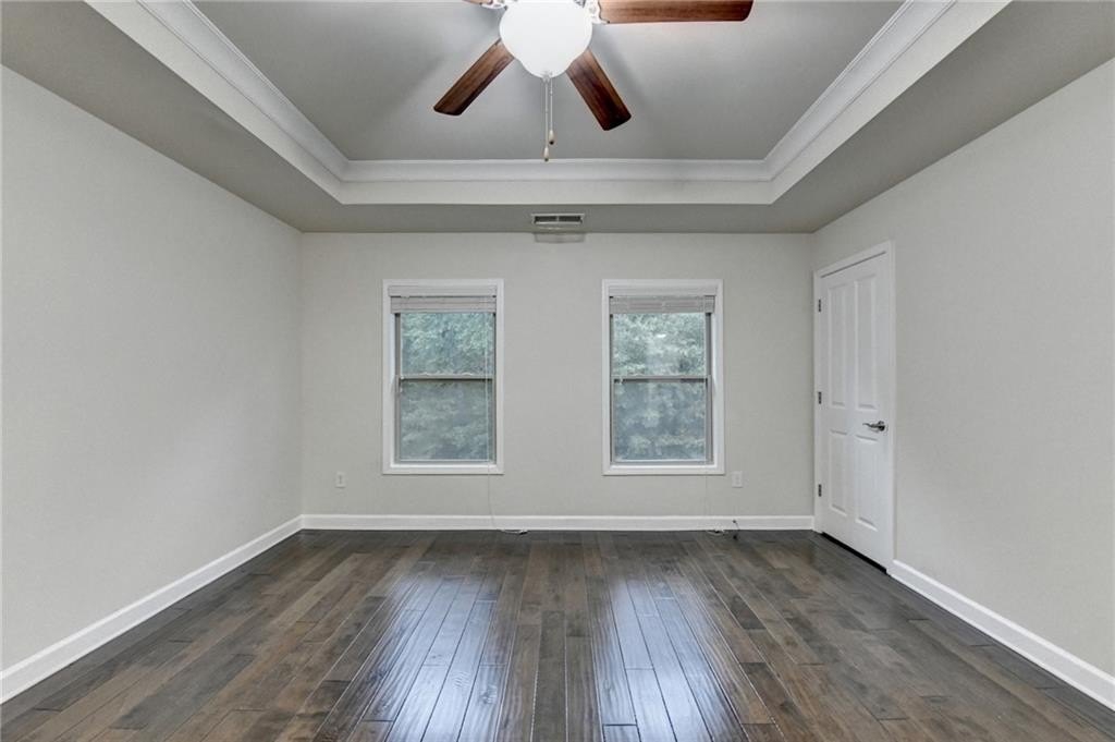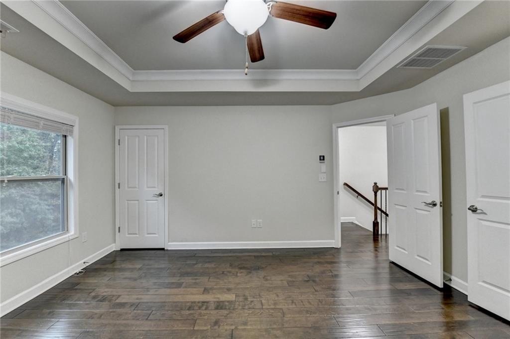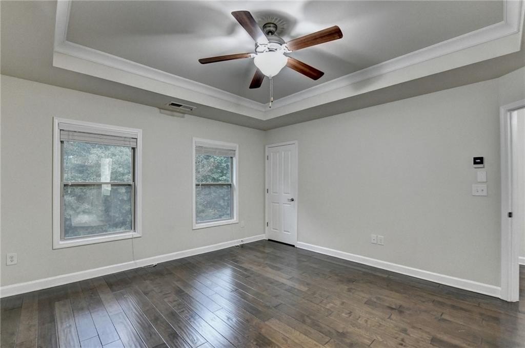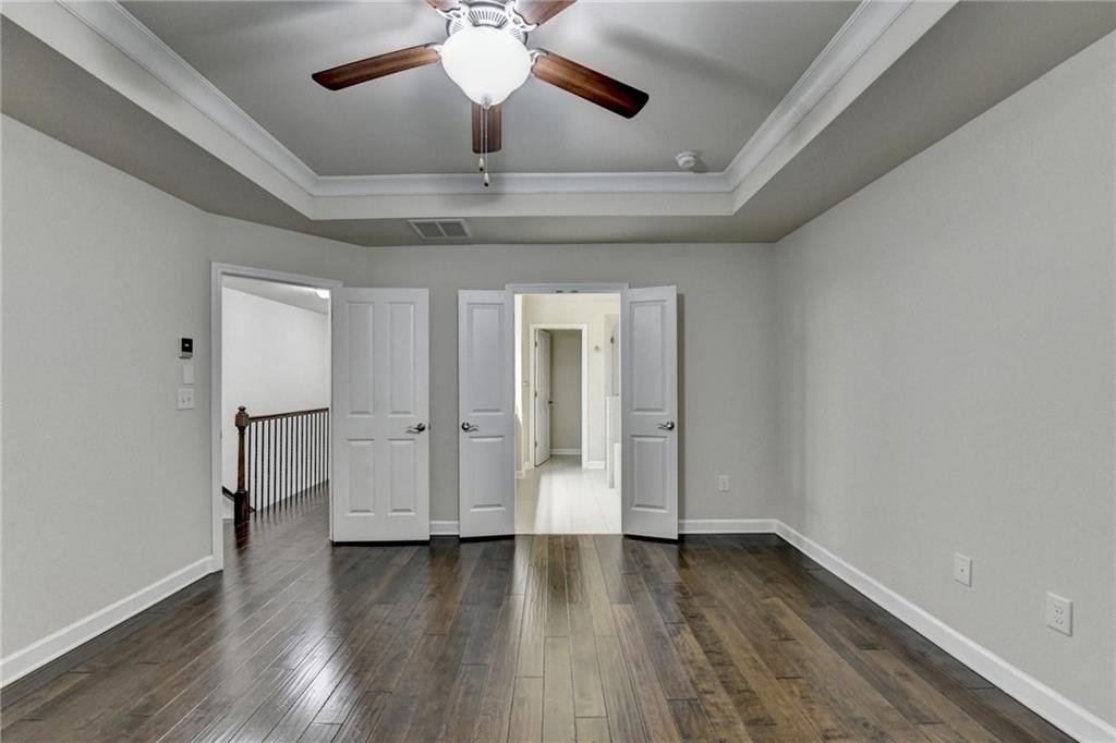 Upstairs, the luxurious owner's suite impresses with a trey ceiling, large walk-in closet, and spa-inspired bath featuring dual vanities, a frameless glass shower, soaking tub, and vaulted ceilings.