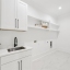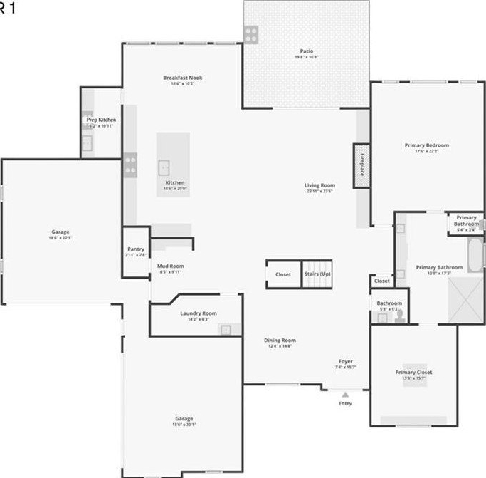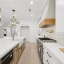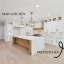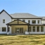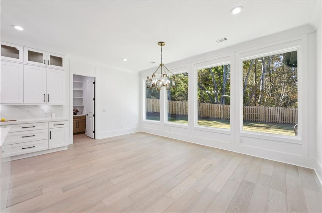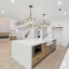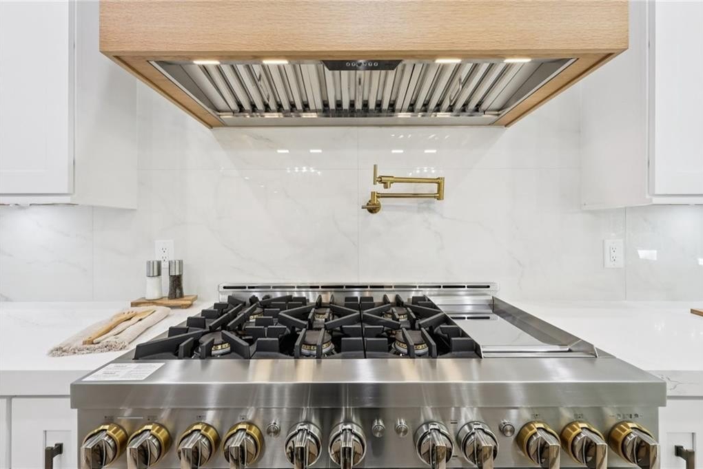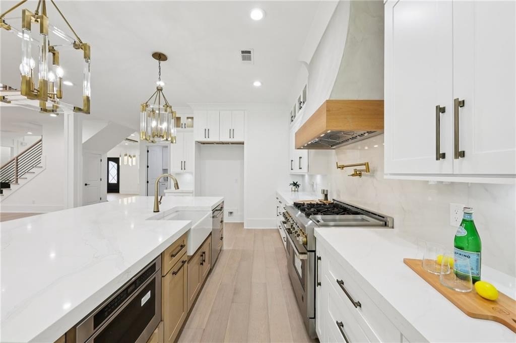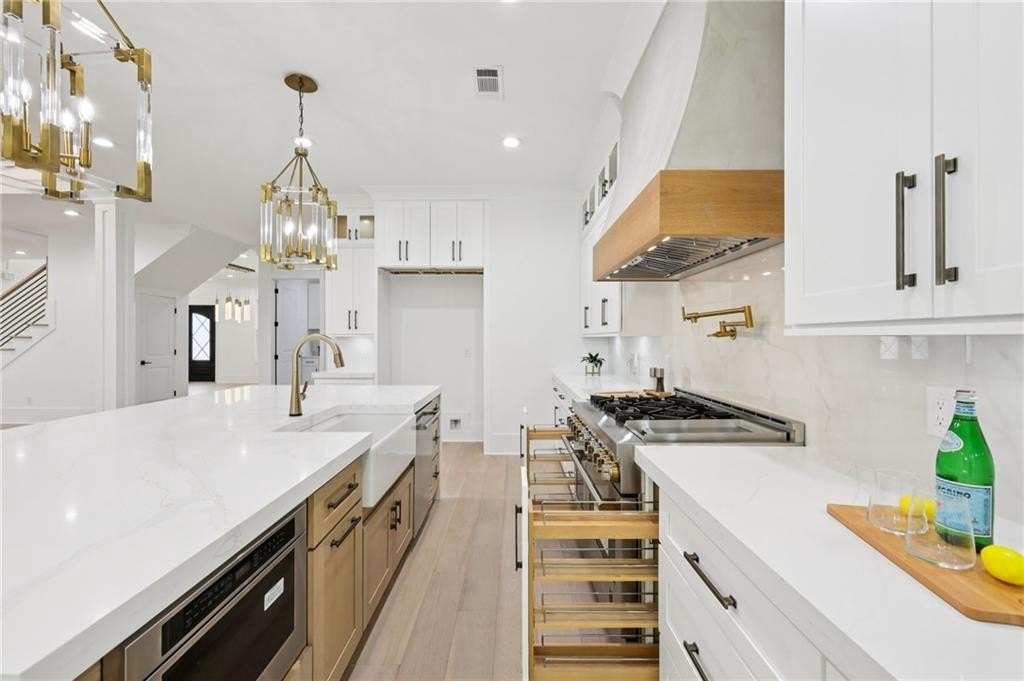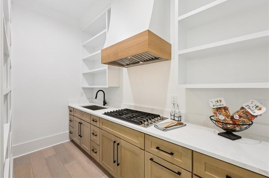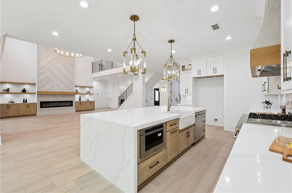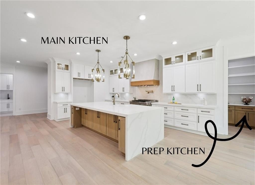 The gourmet kitchen blends beauty and functionality with quartz waterfall counters, custom white oak cabinetry within the island, and farmhouse sink. A separate prep kitchen with JennAir gas range, vented hood, large deep sink, and dual pantries complements a premium JennAir appliance package across both kitchens—perfect for effortless cooking and hosting. Just beyond, a bright breakfast area provides a relaxed space overlooking the backyard.